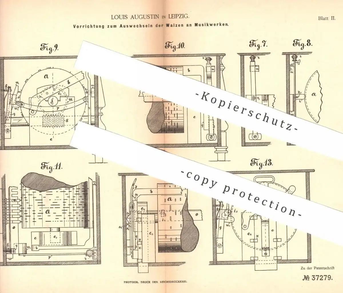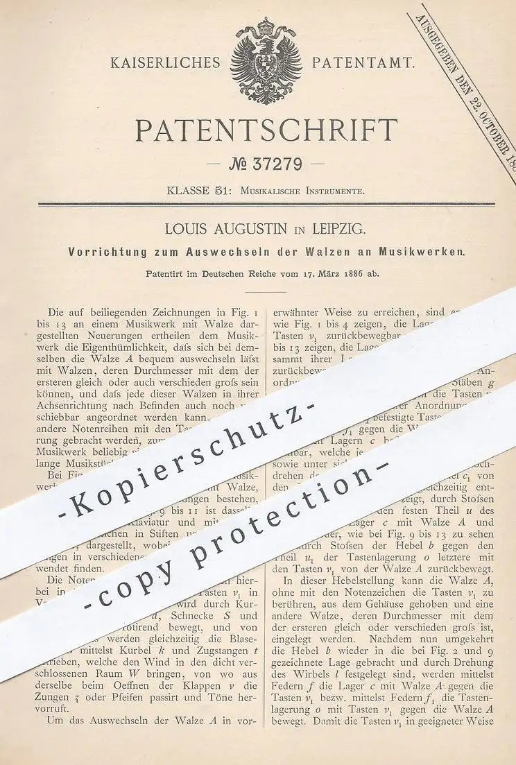 original Patent - Louis Augustin , Leipzig 1886 , Auswechseln der Walzen am Musikwerk | Musik , Musikinstrument , Walze