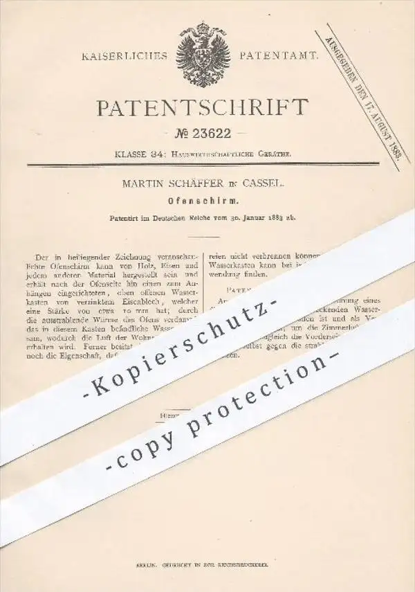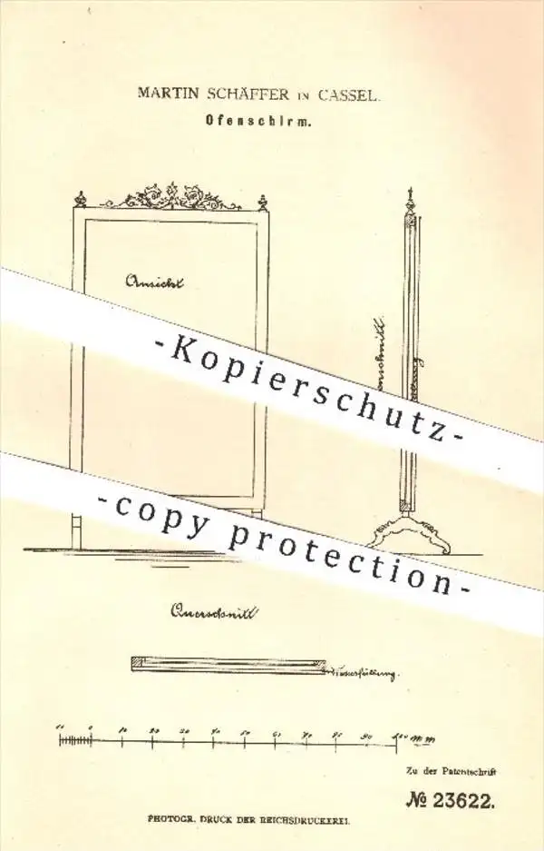 original Patent - Martin Schäffer in Kassel , 1883 , Ofenschirm | Ofen , Öfen , Schirm , Haushalt , Holz , Eisen !!!