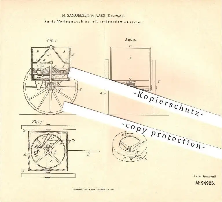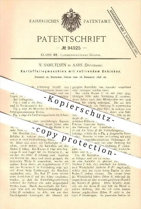 original Patent - N. Samuelsen in Aars , Dänemark , 1896 , Kartoffellegmaschine mit rotierendem Schieber !!!