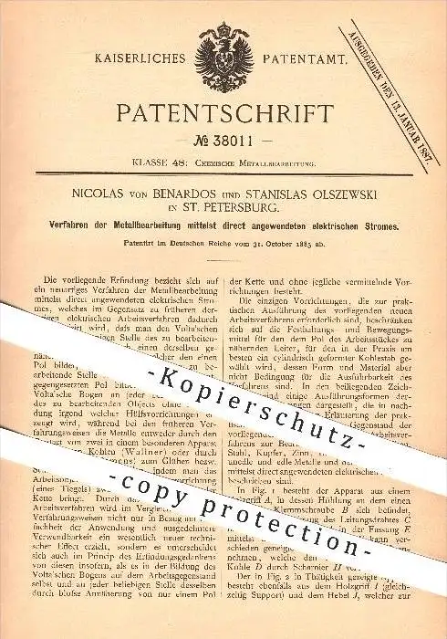 original Patent - Nicolas v. Benardos , Stanislas Olszewski , St. Petersburg , 1885, Metallbearbeitung mit elektr. Strom