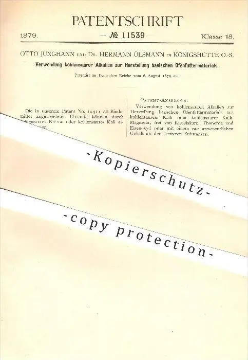 original Patent - O. Junghann , Dr. Hermann Ülsmann , Königshütte , 1879, Herstellung von Ofenfuttermaterial mit Alkalie