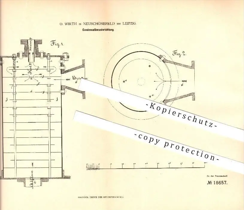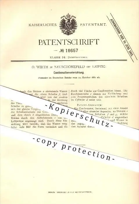 original Patent - O. Wirth in Neuschönefeld bei Leipzig , 1881 , Kondensationseinrichtung , Dampfmaschinen !!!