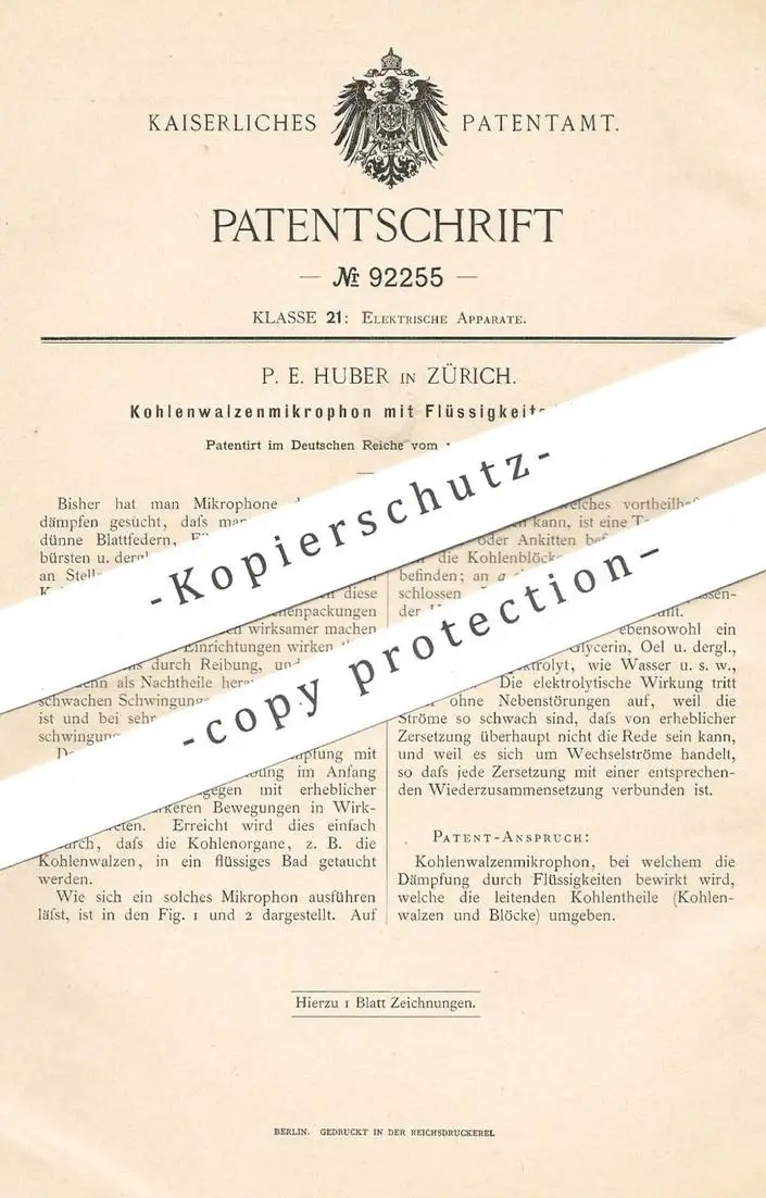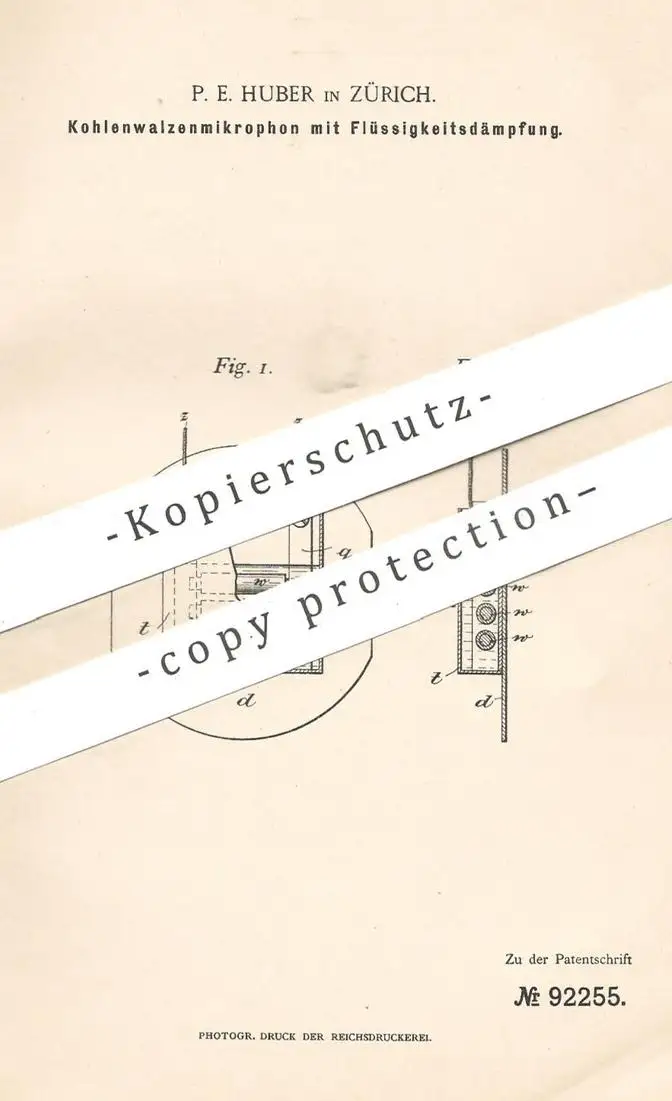 original Patent - P. E. Huber , Zürich , 1896 , Kohlenwalzenmikrophon | Kohlenwalzen - Mikrophon | Mikrofon !!