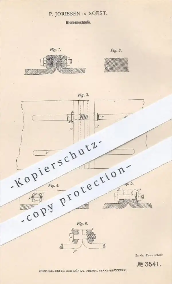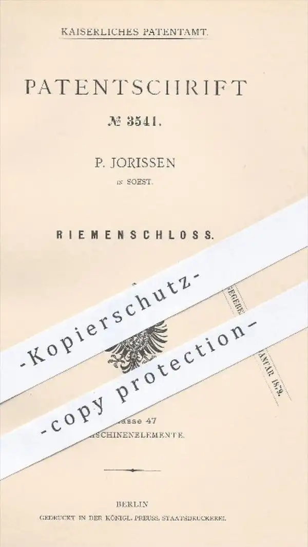 original Patent - P. Jorissen in Soest , 1878 , Riemenschloss | Riemen , Schloss , Riemenscheiben , Maschinen !!!