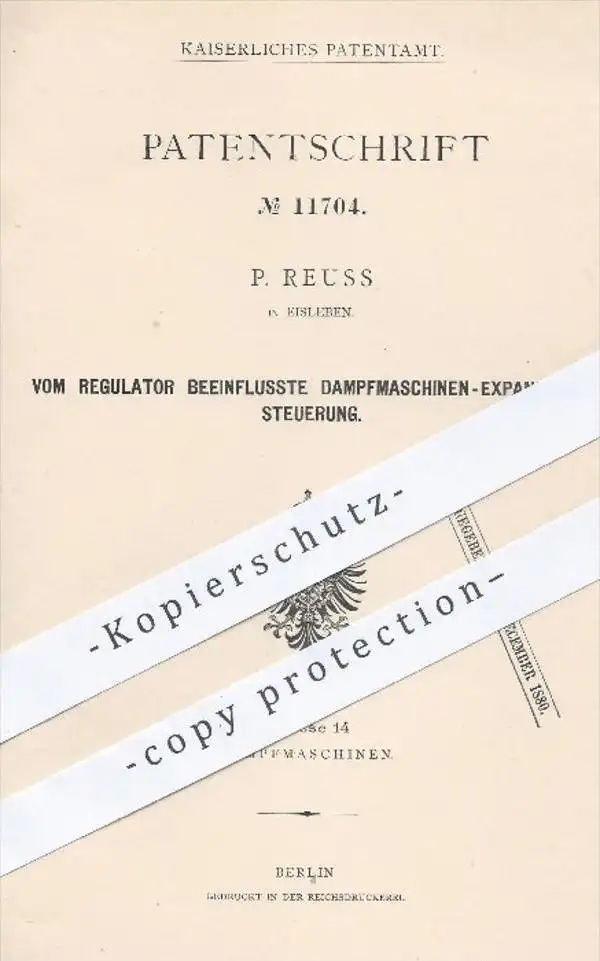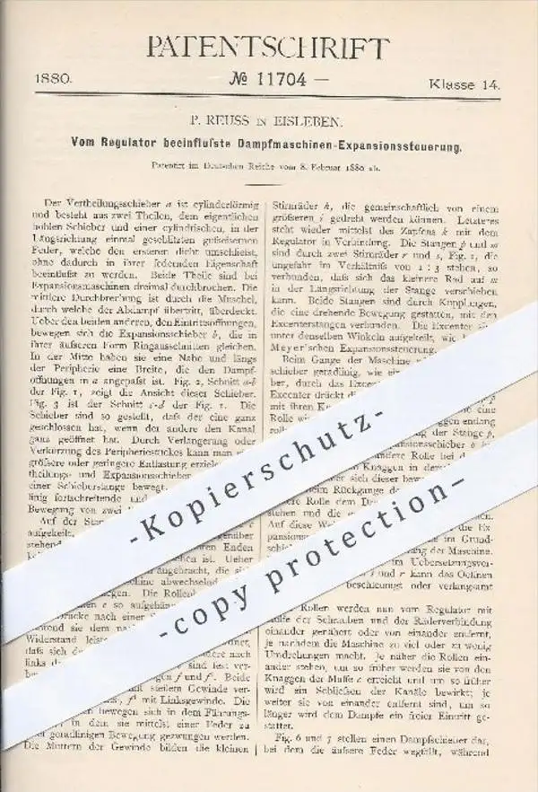 original Patent - P. Reuss , Eisleben , 1880 , Vom Regulator beeinflusste Dampfmaschinen - Expansionssteuerung !!!