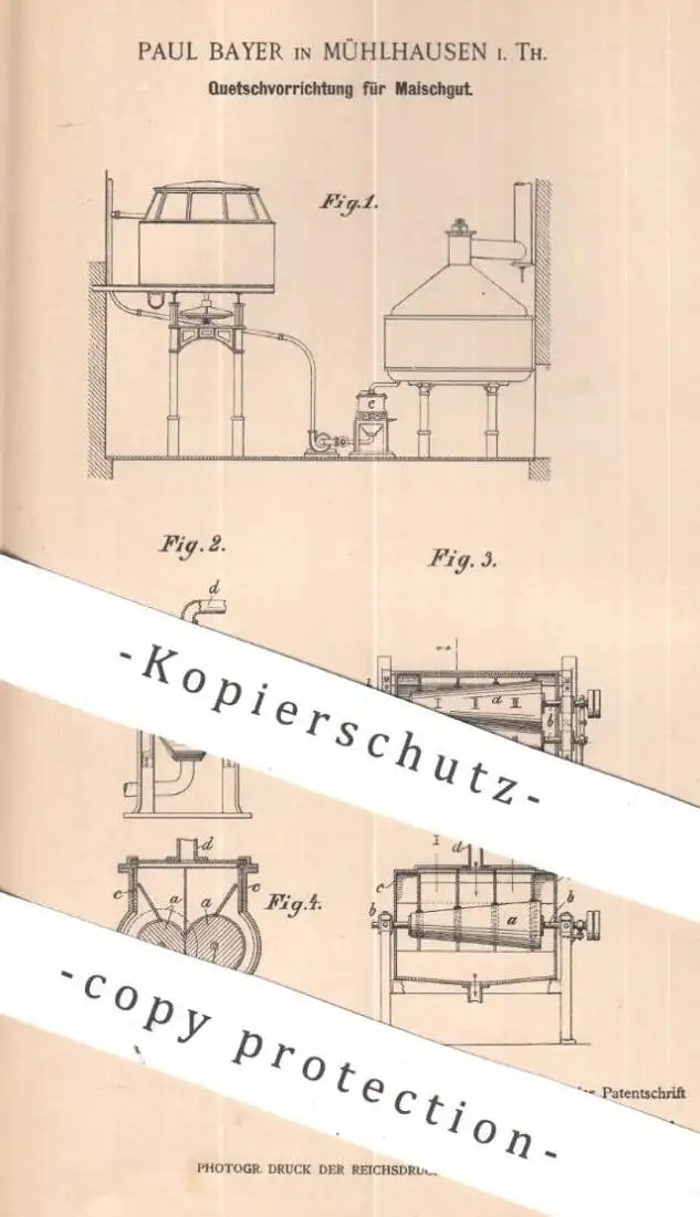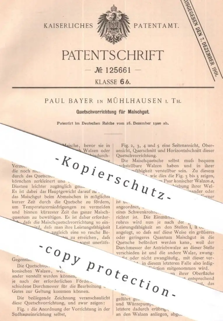 original Patent - Paul Bayer , Mühlhausen , i. Th. | 1900 | Quetschvorrichtung für Maischgut | Maische , Bier , Malz