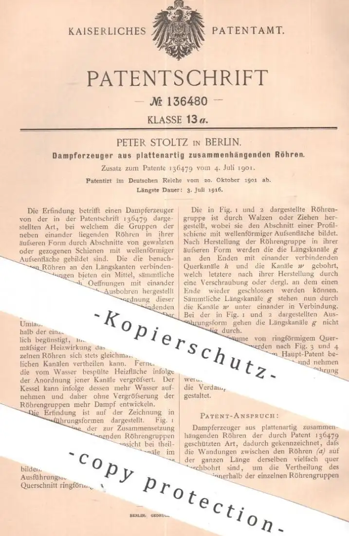 original Patent - Peter Stoltz , Berlin | 1901 | Dampferzeuger | Dampfmaschine , Turbine , Motor , Dampf