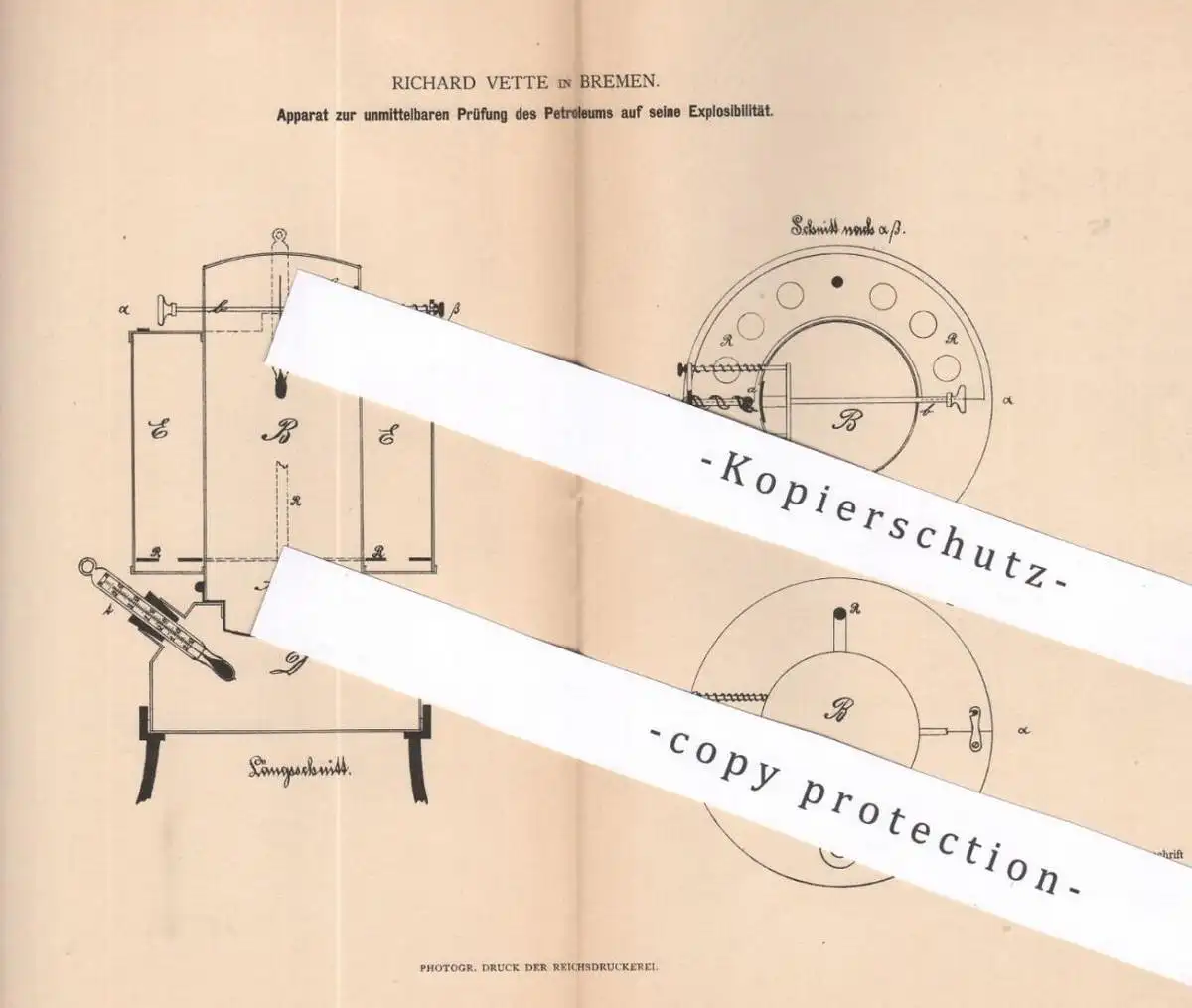 original Patent - Richard Vette , Bremen , 1881 , Prüfung von Petroleum auf Explosibilität | Lampe , Laterne