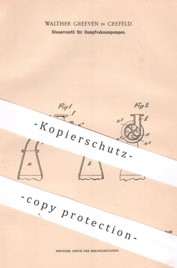 original Patent - Walther Greeven , Krefeld , 1902 , Steuerventil für Dampfvakuumpumpen | Ventil , Pumpe , Pumpen !!