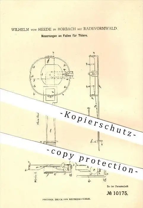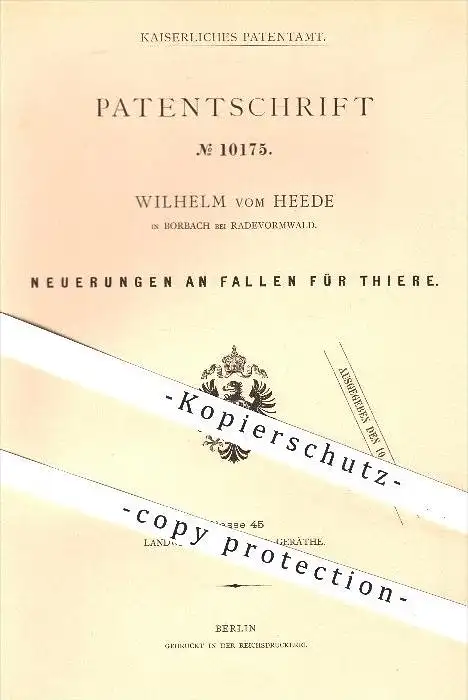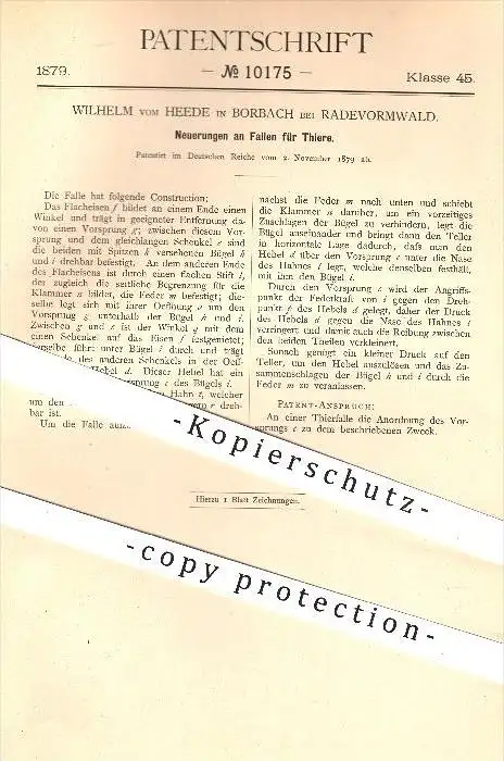 original Patent - Wilhelm vom Heede in Borbach bei Radevormwald , 1879 , Fallen für Tiere , Tierfallen , Tier , Jagd !