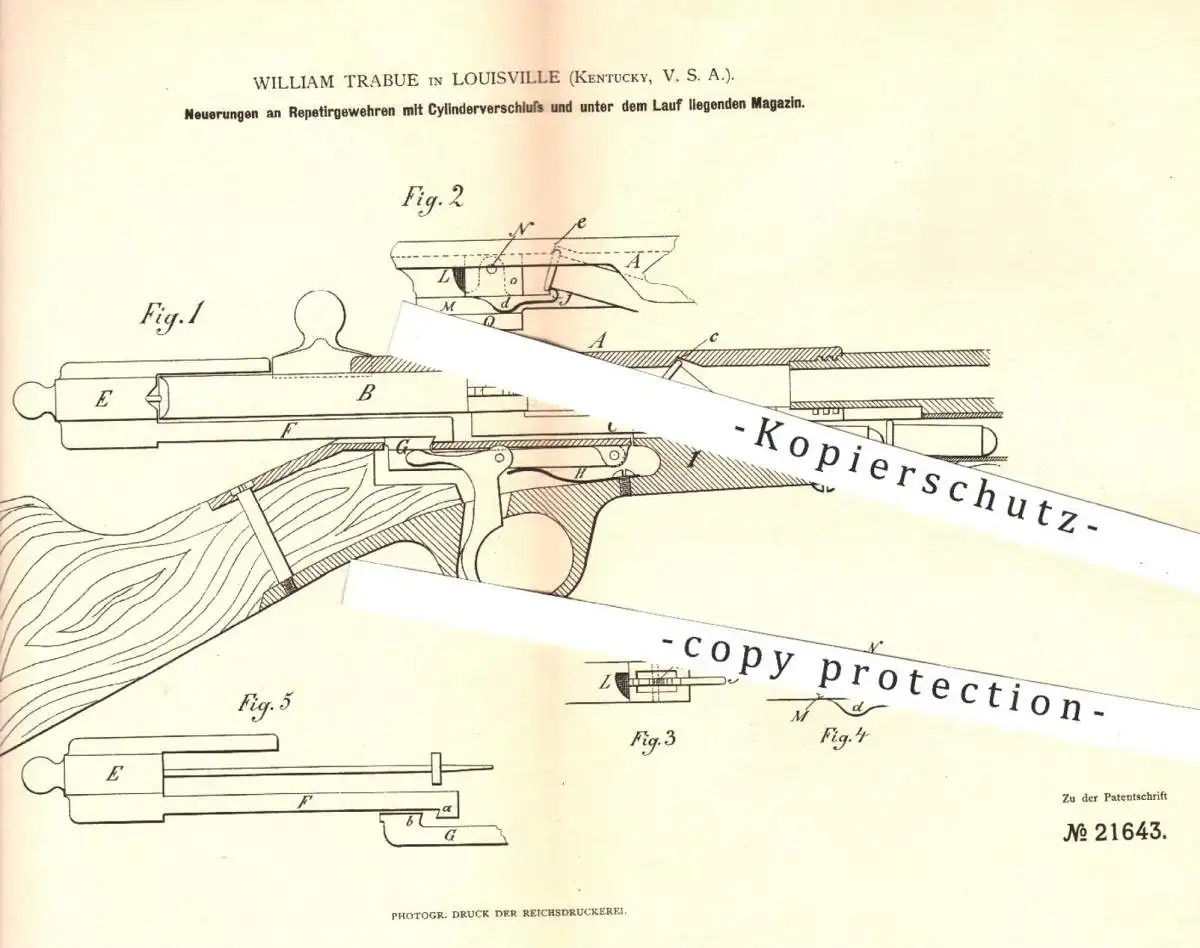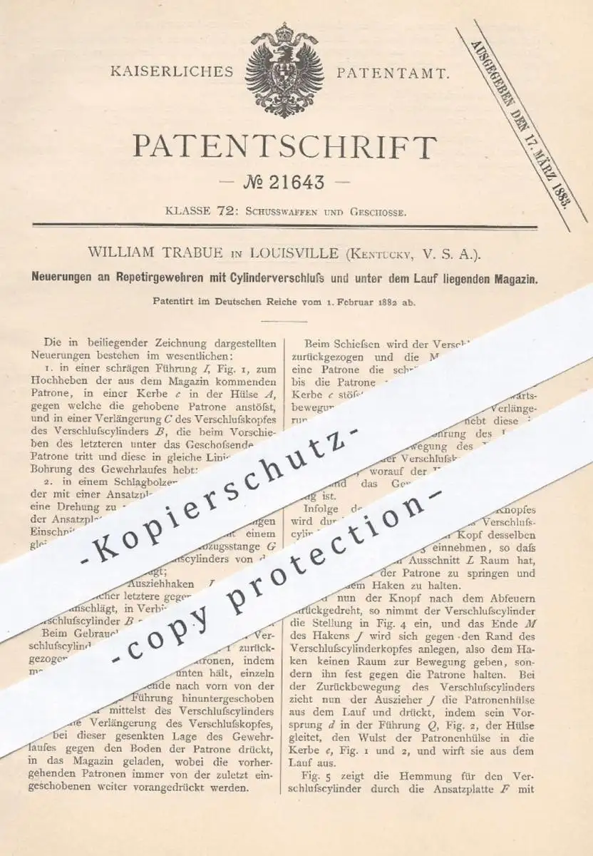 original Patent - William Trabue , Louisville , Kentucky USA , 1882 , Repetiergewehr | Gewehre , Waffen , Jagd , Militär