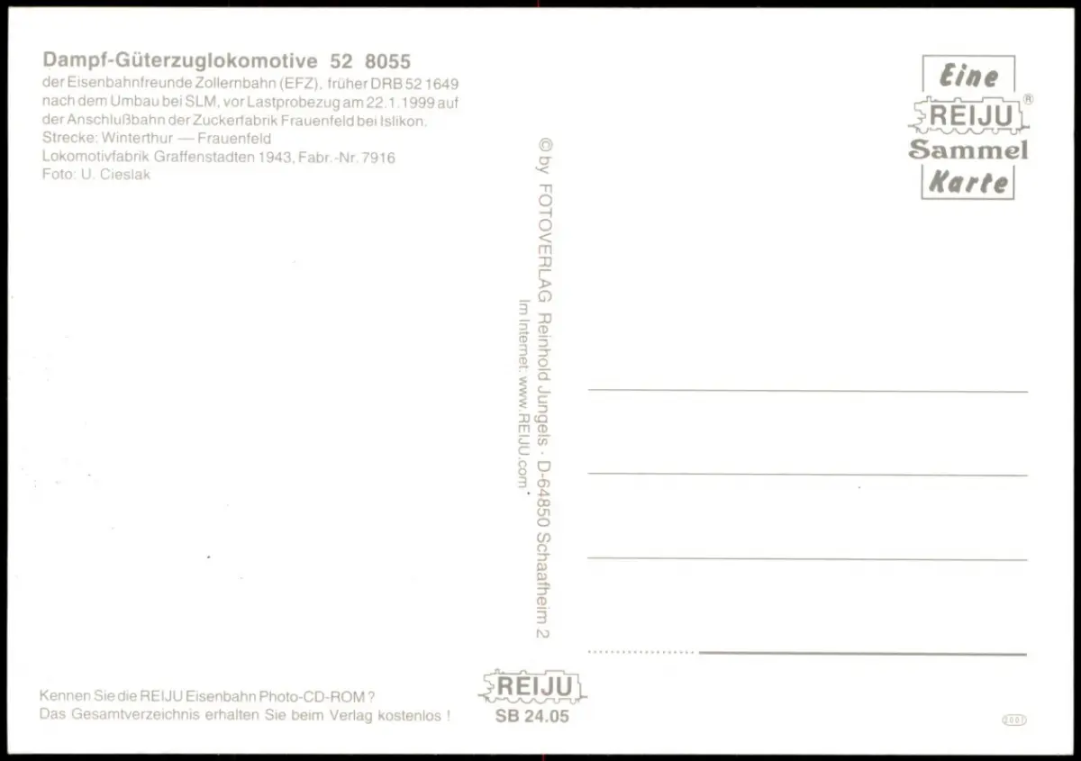 Infos: Dampf-Güterzuglokomotive 52 8055 der Eisenbahnfreunde Zollernbahn (EFZ), früher DRB 52 1649 nach dem Umbau bei SLM, vor einem Lastprobezug am 22. Januar 1999 auf der Anschlußbahn der Zuckerfabrik Frauenfeld bei Islikon. Die Lokomotive wurde 1943 von der Lokomotivfabrik Graffenstadten mit der Fabrik-Nr. 7916 gebaut. Die Strecke ist Winterthur-Frauenfeld. Das Foto stammt von U. Cieslak. Herausgegeben vom FOTOVERLAG Reinhold Jungels (REIJU), D-64850 Schaafheim, als 'REIJU Sammel Karte'. Die Karte wurde voraussichtlich 2001 veröffentlicht.