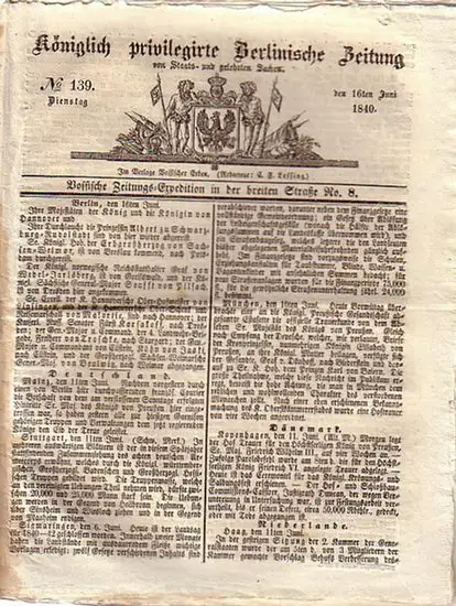 Königlich privilegirte Berlinische Zeitung von Staats- und gelehrten Sachen. - C. F. Lessing (Redacteur): Königlich privilegirte Berlinische Zeitung von Staats- und gelehrten Sachen. No 139, Dienstag den 16ten Juni 1840. U.a. mit Berichten von den Königsh