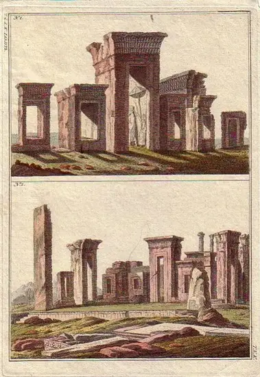 Freie Beschreibung:27x19cm. Einzelblatt Original mit zwei Abbildungen handcoloriert. N. 1 und N. 2 links oben längs "V. ü. d. K. I. Abb. II Th." unten rechts längs "T.K.K.". Abgebildet sind zwei Ruinendarstellungen. Sehr gutes Exemplar