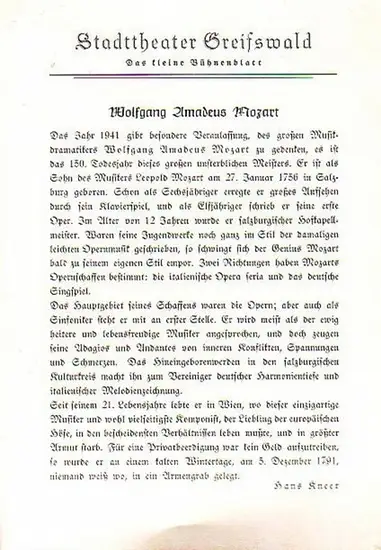 Stadttheater Greifswald - W.A.Mozart / Koch (Int.Regie) / Kneer (Hrsg.): Stadttheater Greifswald - Das kleine Bühnenblatt 1941 Präsentiert die Oper "Die Zauberflöte". Herausgegeben von Dr.Claus Dietrich Koch und Hans Kneer.