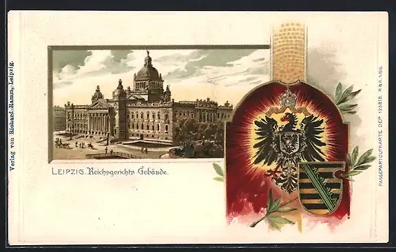 Passepartout-Lithographie Leipzig, Reichsgerichtsgebäude mit Wappen