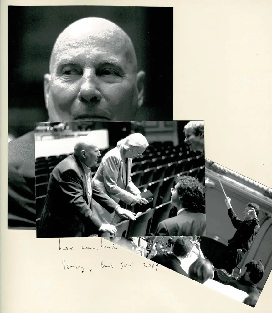Hans-Werner Henze (1929-2012), einer der bedeutendsten deutschen Komponisten der Moderne.- Henze, der nach dem Krieg nach Italien übergesiedelt war, schrieb Instrumental- und Vokalmusik, weltliche und geistliche Werke, Sinfonien und Opern, darunter eine Kinderoper. Libretti zu Henzes Musik schufen Ingeborg Bachmann, Hans Magnus Enzensberger, Hans-Ulrich Treichel, Edward Bond u.a. - Das Foto wurde aufgenommen während der Proben zu einer Konzertreihe zu Ehren von Henzes 75. Geburtstag in der Hamburger Laeiszhalle. - BEIGABE: 3 kl. Fotos (8 x 12 cm) vom selben Anlaß, darunter ein Portrait Henzes im Dreiviertelprofil und eine Darstellung des dirigierenden Peter Ruzicka