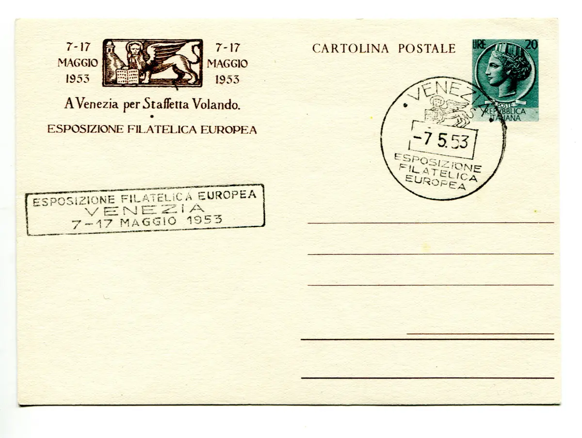 C.P. Syrakus Lire 20 Europäische Philatelistische Ausstellung Nr. C 149 gebrauchte Postkarte - C.P. Syrakus Lire 20 Europäische Philatelistische Ausstellung Nr. C 149 gebraucht mit Sonderstempel Venedig Erstausgabetag Cod. 1148/13