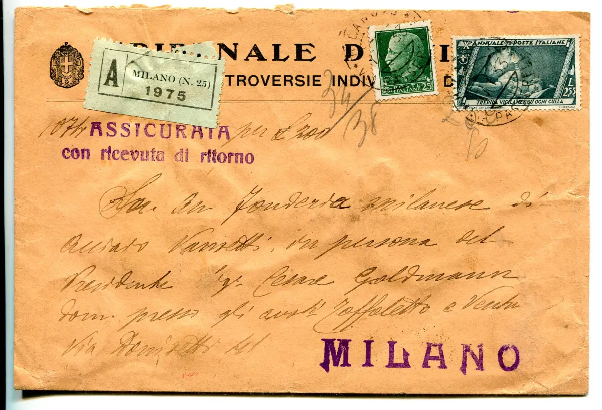 - Decennale Lire Lire 2,55 Nr. 338 + Ergänzung Nr. 248 auf Umschlag ass. mit Rückschein aus Mailand in die Stadt? am 17.1.33 - Ungewöhnliche Nr. 197/A