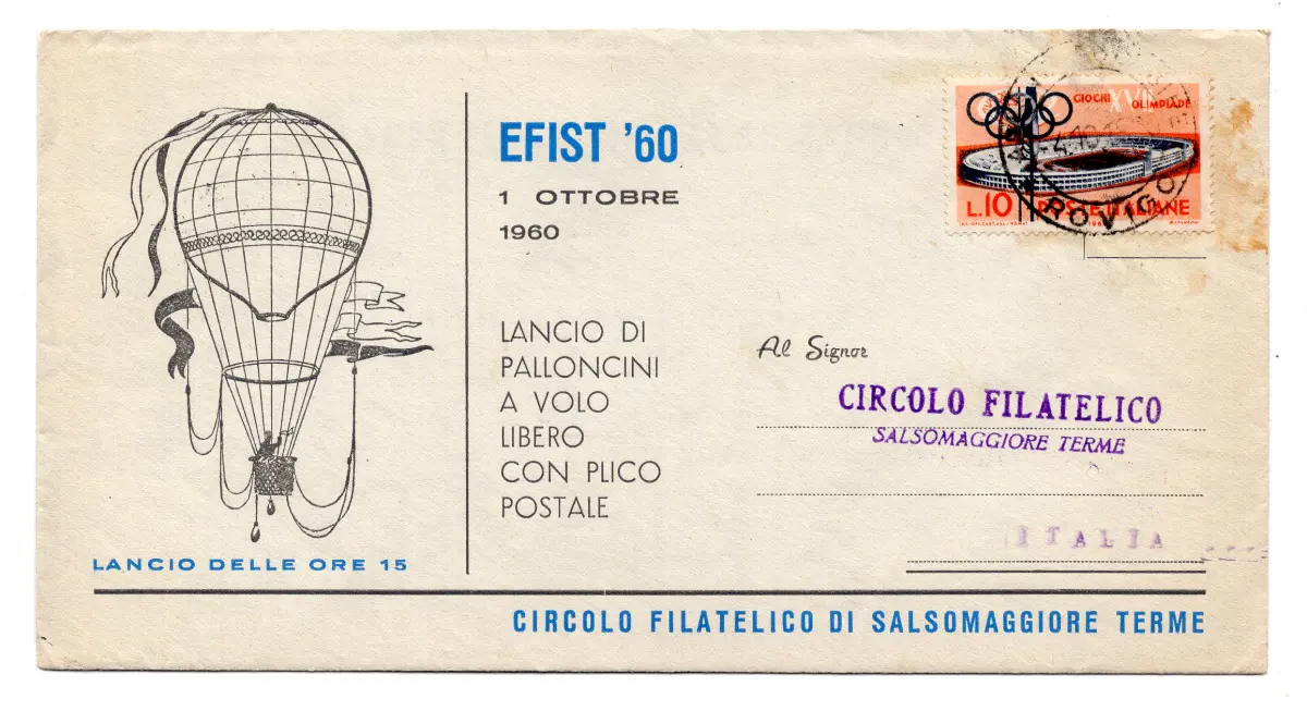 - EFIST '60 - Umschlag mit Ballon von Salsomaggiore T. um 15 Uhr vom Finder zurückgeschickt - Anlässlich der philatelistischen Veranstaltung wurden Luftballons mit jeweils einem gleichwertigen Stück geworfen, mit Aufforderung zur Rücksendung an den Abholer - Selten, da nur sehr wenige Umschläge wahrscheinlich weniger als zehn Nr. geborgen wurden. 599/18