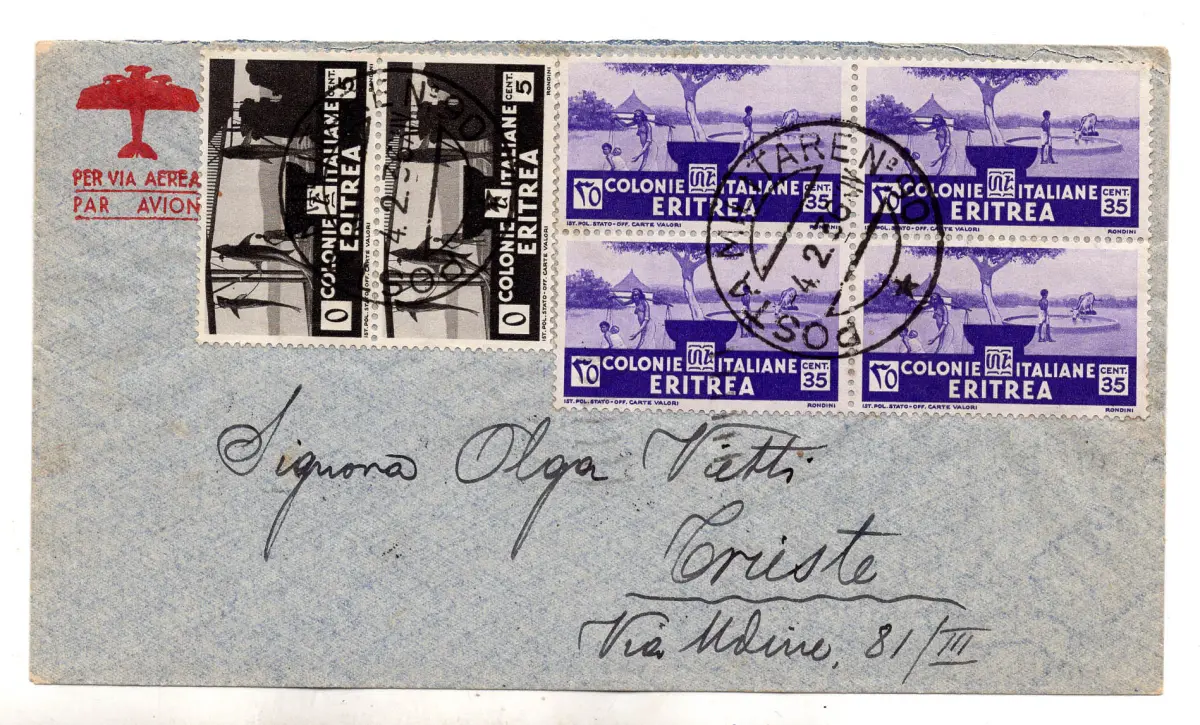 Eritrea - Cent. 35 Viertel + Ergänzung auf Umschlag für Triest - Eritrea - Cent. 35 Nr. 208 Viertel + Ergänzung Nr. 203 Paar auf Umschlag nach Triest am 4.2.38 - Ab Jahrgang Militärpost Nr. 90 - Selten - Kat. euro 350 n. 1245/20