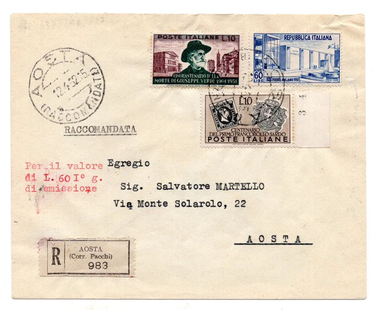 - Mailand '52 Nr. 685 + Ergänzungen Nr. 672 + 677 auf Umschlag Racc. (ohne Ann. Ankunft) von Aosta in die Stadt am 12.4.52 - Ungewöhnlich I. Tag der Ausgabe und Verwendung von Zwillingswerten von 10 Lire Nr. 452/18