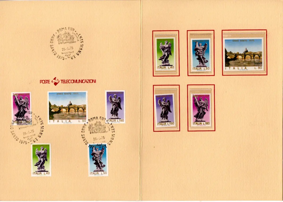 Gebraucht - Vorläuferfolder 1975 - Heiliges Jahr - Ausgestellt von der italienischen Post anlässlich des Heiligen Jahres 1975 - Enthält die neu ausgegebene Briefmarkenserie und neben der Serie mit abgebildetem Stempel Rom EUR (Katalog Typ P7) - Selten - Für Spezialisten Cod. 4007 / WEB