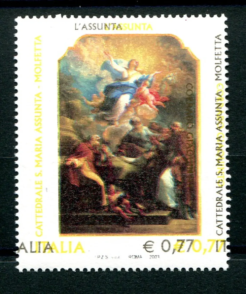 Corrado Giaquinto stark verschobener Golddruck, ** MNH - Corrado Giaquinto - Wunderschönes Exemplar mit stark verschobenem Golddruck, der Aufschrift Kathedrale von Molfetta.. in Gold ist rechts statt links und links gelb wiederholt und wiederholt, während Corrado Giaquinto auf dem Gemälde aufgedruckt ist - Code Nr. 371/web