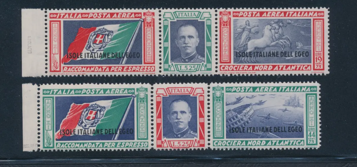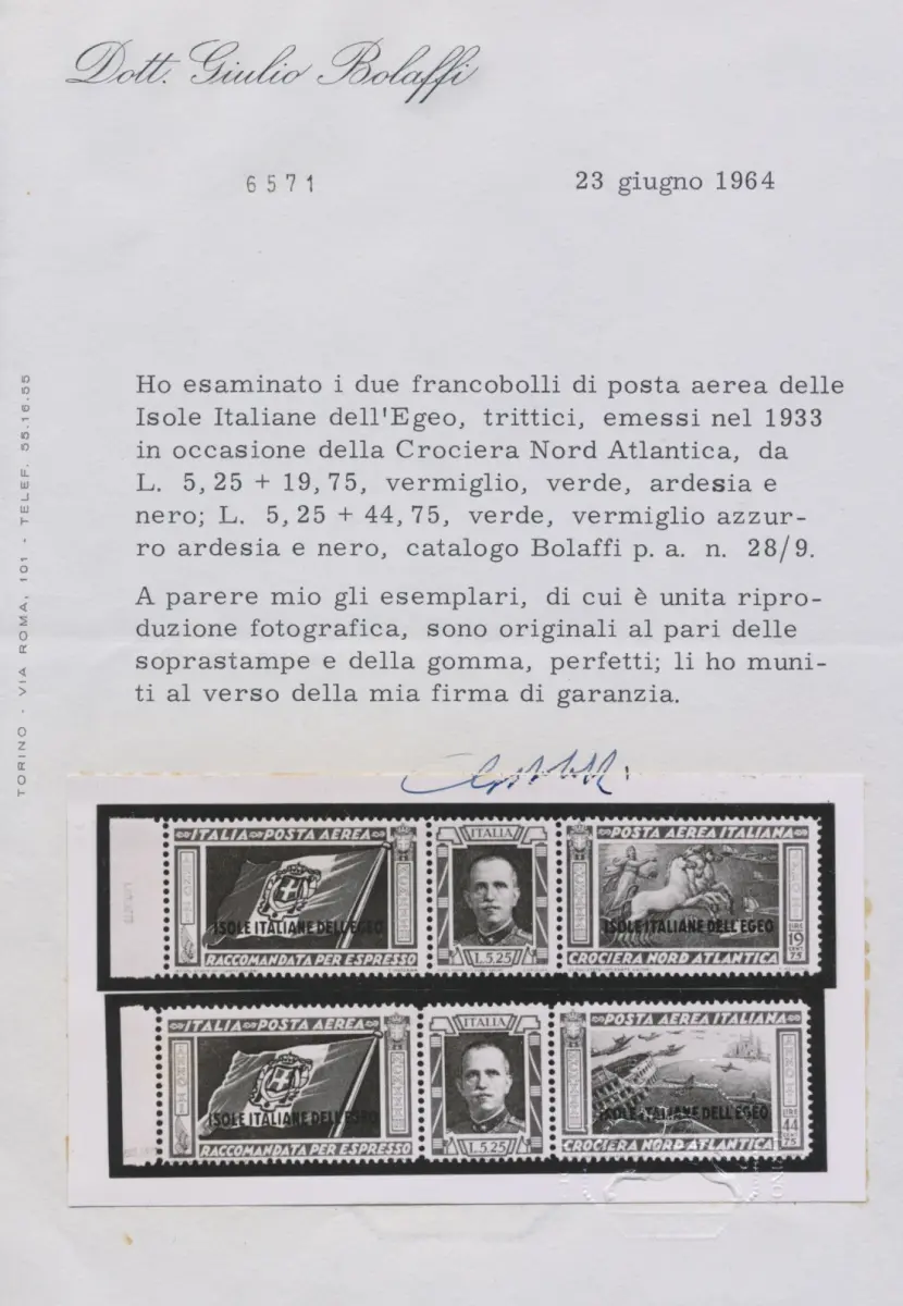 1933 ÄGÄIS, Luftpost - Tripttici Balbo 28/29 MNH ** Signatur Bolaffi + Zertifikat Wert von 5,25 Lire + 44,75 signiert Bolaffi und Historisches Zertifikat Bolaffi Sächsischer Katalog Euro 600 rote Box mit Königreich