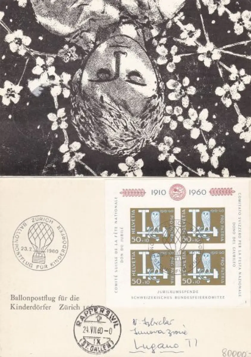 Pro Patria Zumstein Bl 17 auf Karton für den Postballonflug am 23.7.60, Sonderstempel FSv 45 A/Briefe