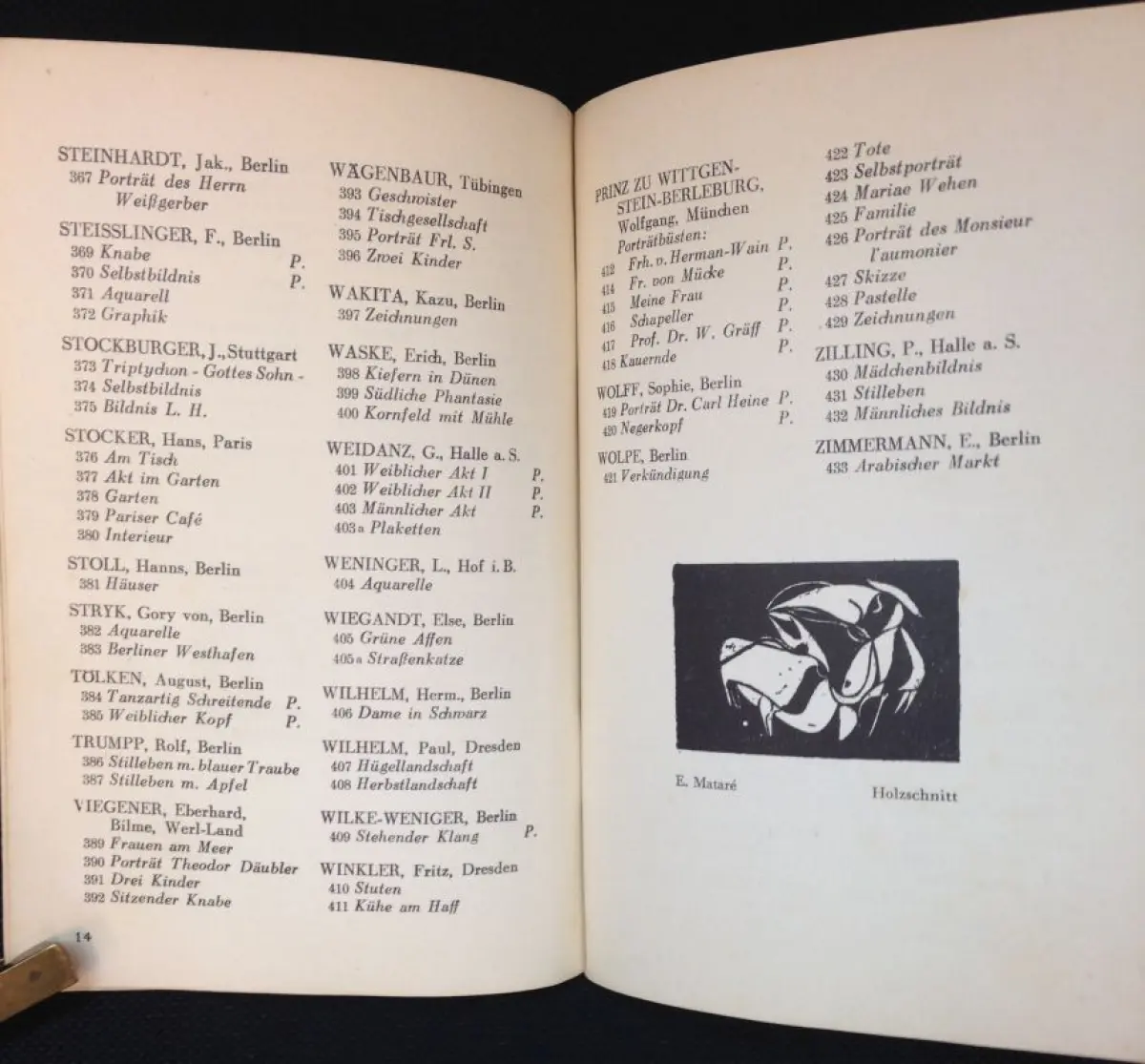 Der Katalog listet 433 Werk auf, u.a. von Jankel Adler, A. Kerschbaumer, Georg Marcks, Ewald Mataré, E. W. Nay, A. Räderscheidt, Otto Staiger, Erich Waske. - Umschlag lichtrandig und am Rücken mit Einrissen u. Fehlstellen, Klammerheftung gerostet u. etwas gelockert, sonst gut erhalten.