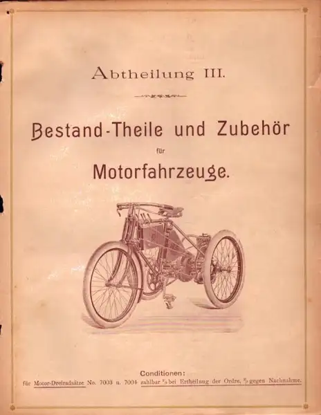 148 Seiten 29 x 23 cm Auch 12 Seiten Bestandteile und Zubehör für Motor-Fahrräder und Wagen Mit Gebrauchsspuren, Einband stärker beschädigt, mit kleineren Fehlstellen, Motor-Fahrrad-Teil lose