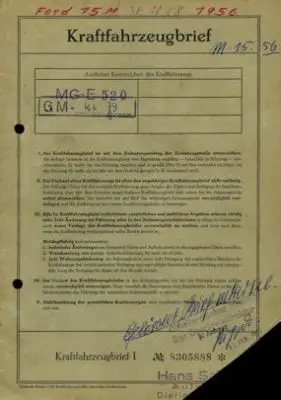 Ford Taunus 15 M Original Fahrzeugbrief 1956