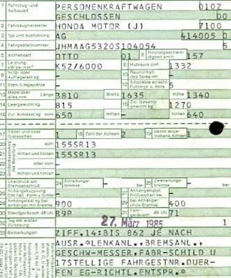 Honda Civic (Typ AG) Original Fahrzeugbrief 1985