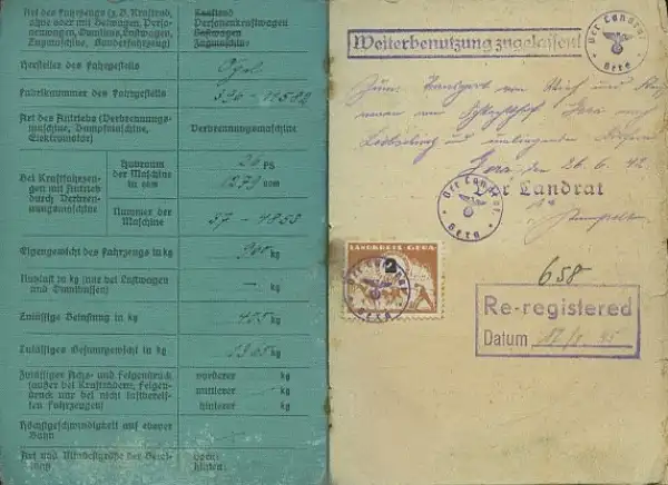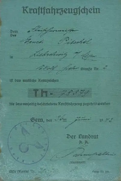 Opel Olympia 1279 ccm Fahrzeugschein 1942