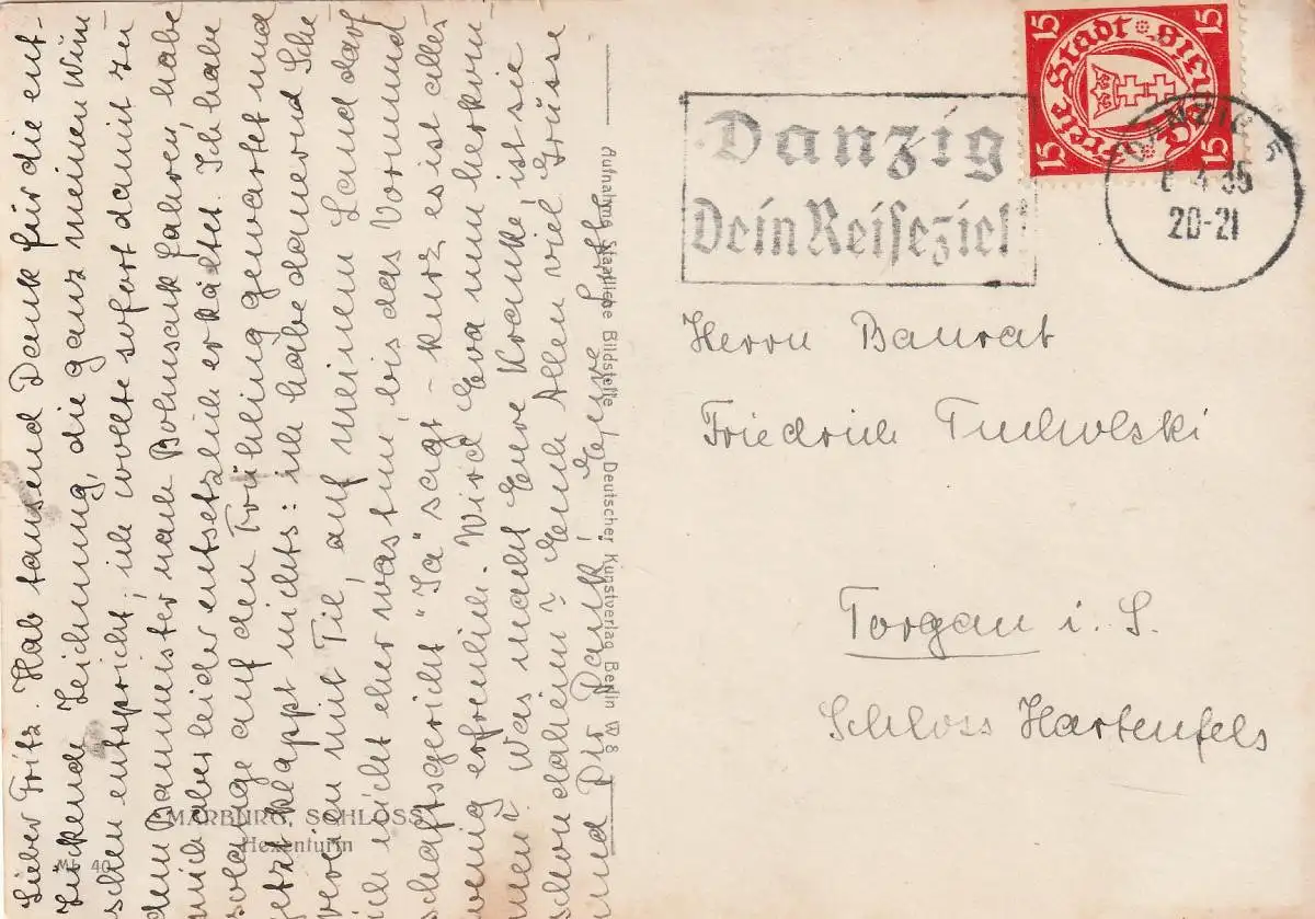 Titel: 3550 MARBURG, Schloss, Hexenturm, 1935, DANZIG - Frankatur