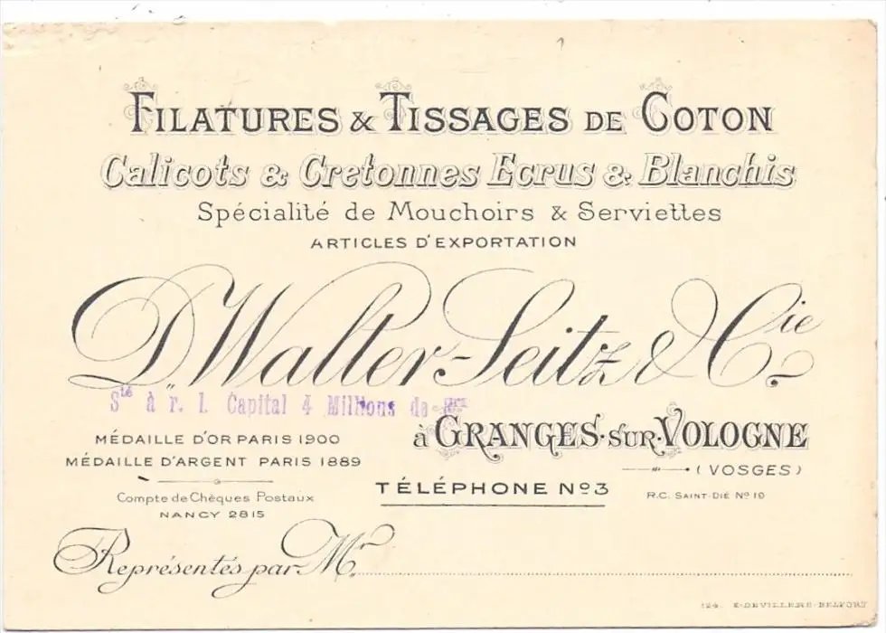 F 88640 GRANGES - SUR - VOLOGNE, Vertreterkarte Walter Seitz & Cie.