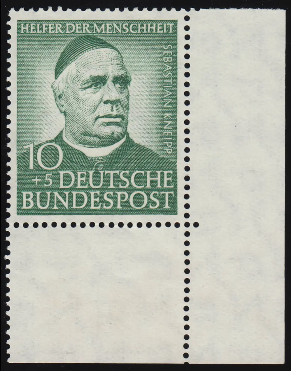 Bund Wohlfahrt 10 Pfennig Sebastian Kneipp 1953 MICHEL 174 WZY mit dem besseren Wasserzeichen Y, tiefst geprüft Schlegel BPP. Ungefaltet und unbeschriftet.