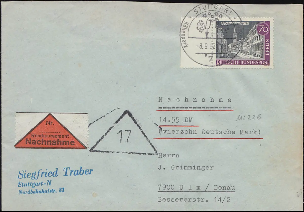 226 Alt-Berlin 70 Pf Parochialkirche NN-Brief Stuttgart - Ulm 8.9.1962