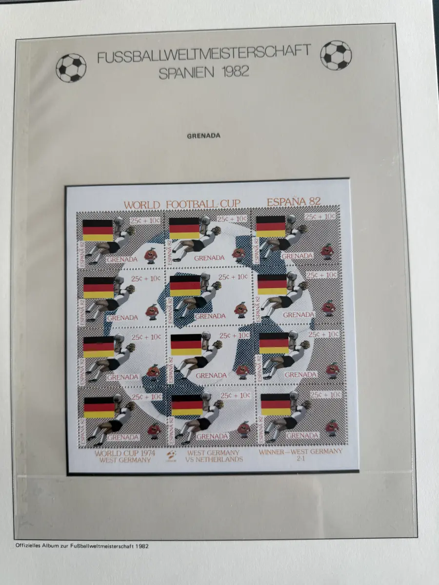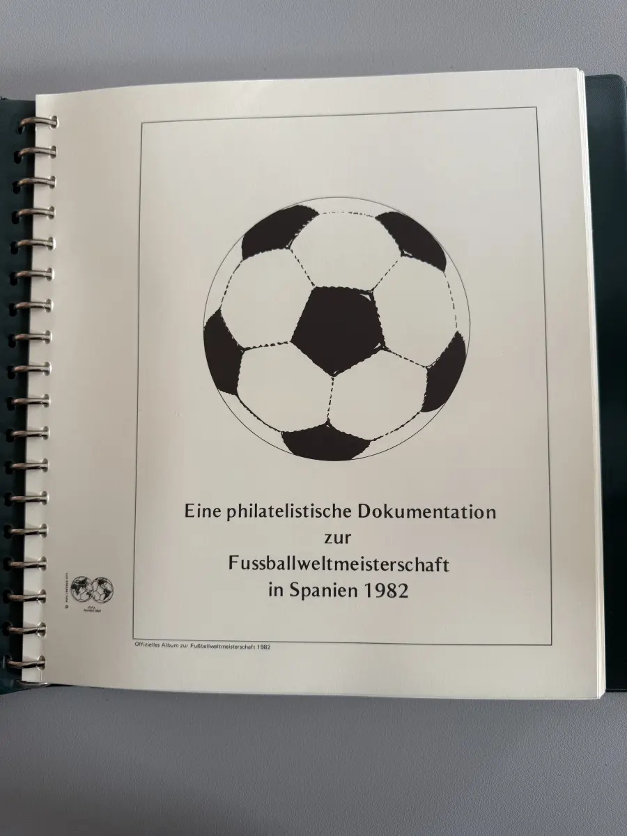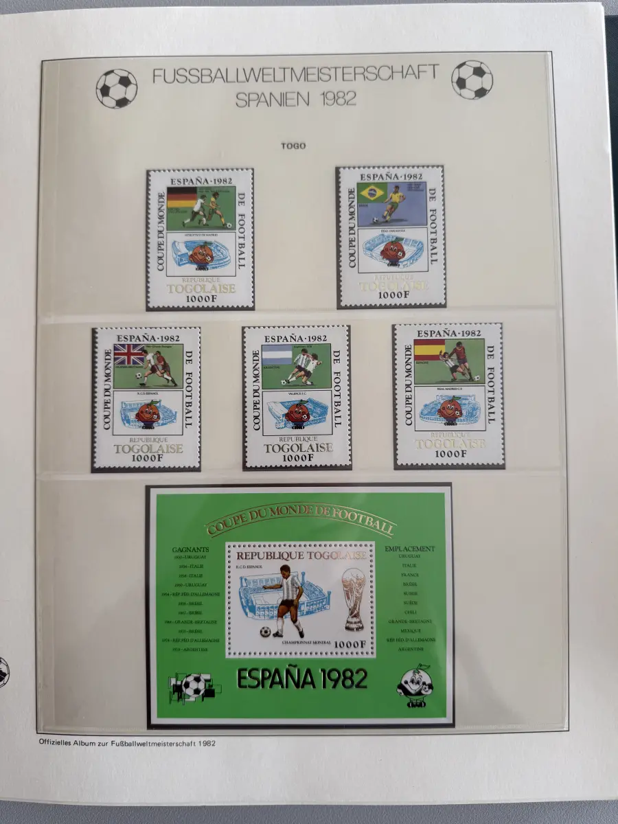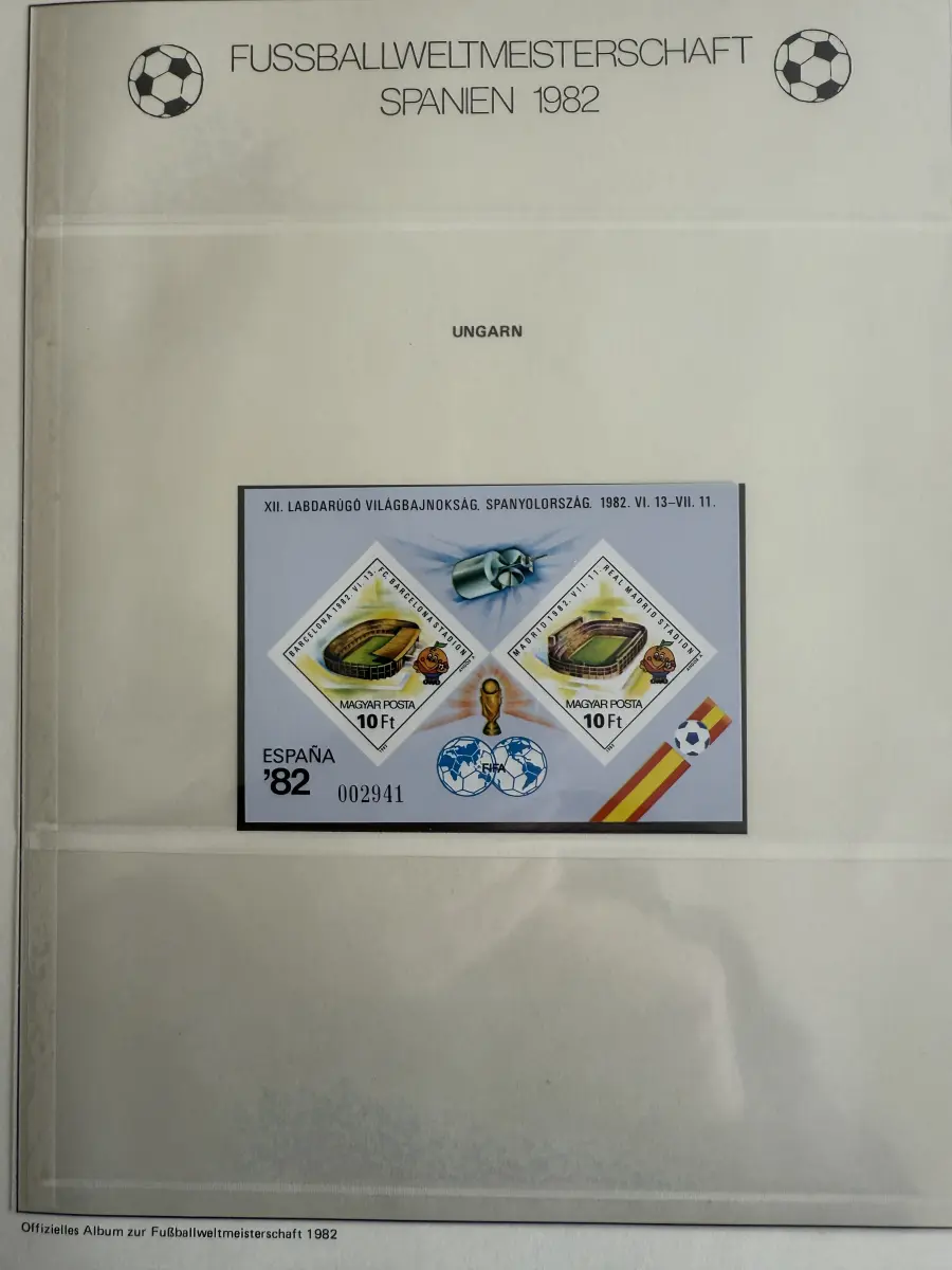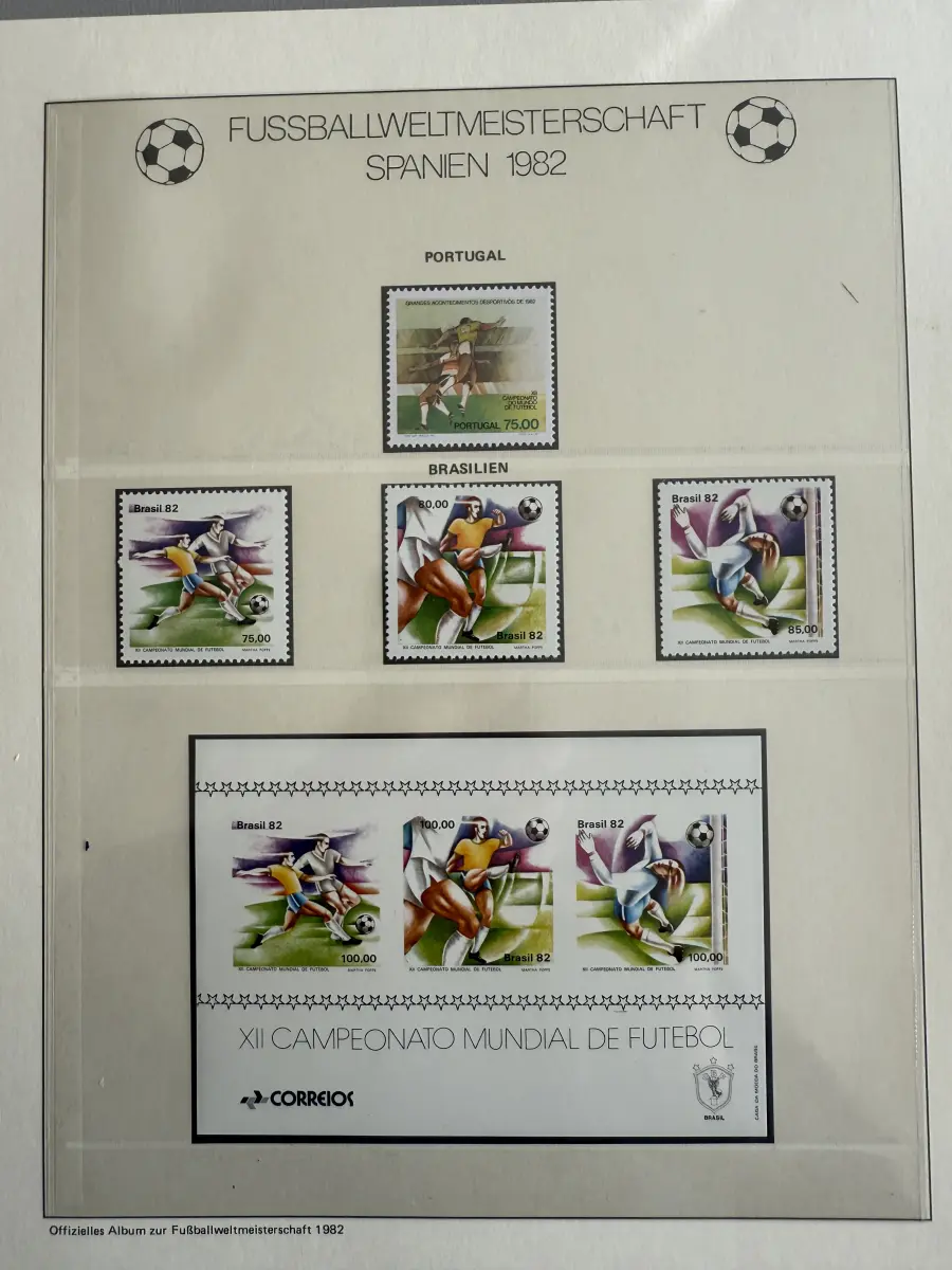 Sammlung zur Fußball-Weltmeisterschaft 1982 in Spanien, in vier prallvollen offiziellen FIFA-Vordruckbindern nach Sieger-Abo gesammelt. Die gut erhaltenen grünen Lindner-T-Vordruckbinder zeigen alle die passende Goldprägung. Auf über 240 Vordruckblättern finden sich die postfrischen Briefmarken und Blöcke von Andorra bis Zentralafrika, die zu diesem Anlass erschienen sind - ergänzt mit interessanten Belegen. Von einigen Ausgaben sind auch die teuren ungezähnten Parallel-Ausgaben enthalten. Der Abopreis war gigantisch!