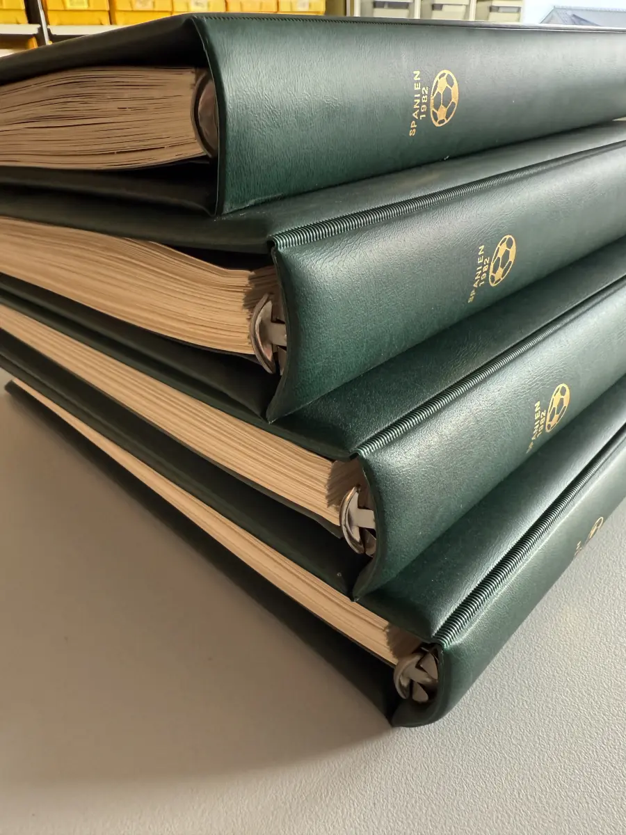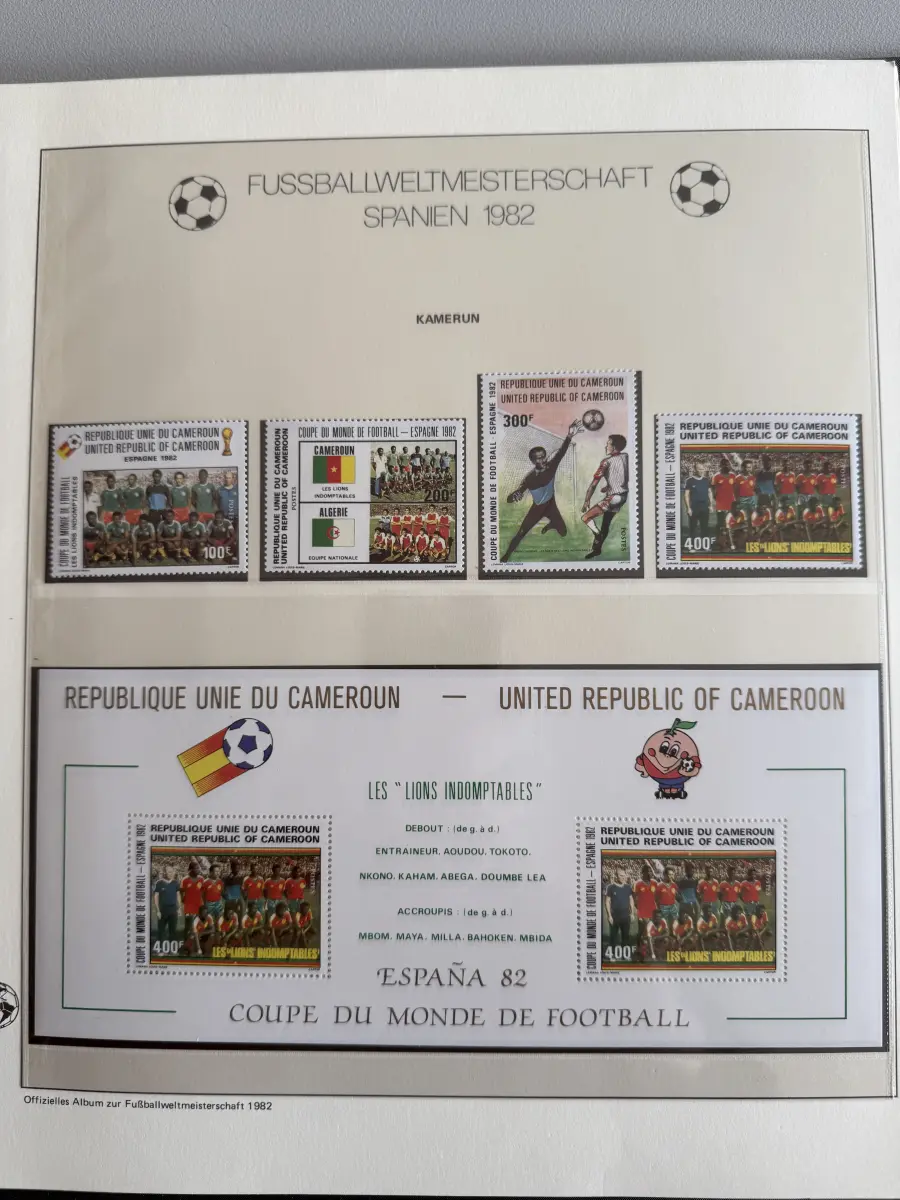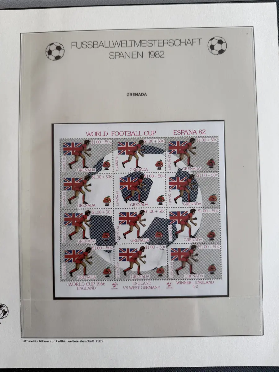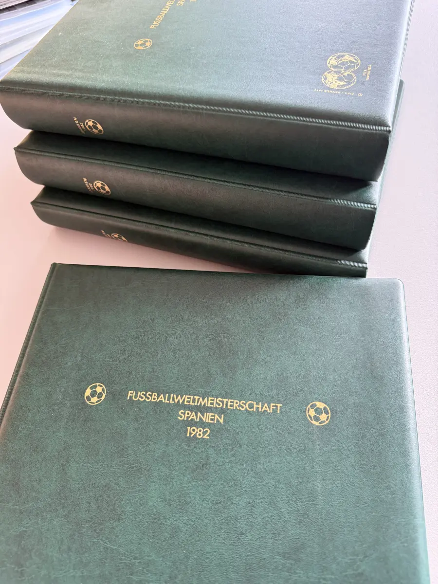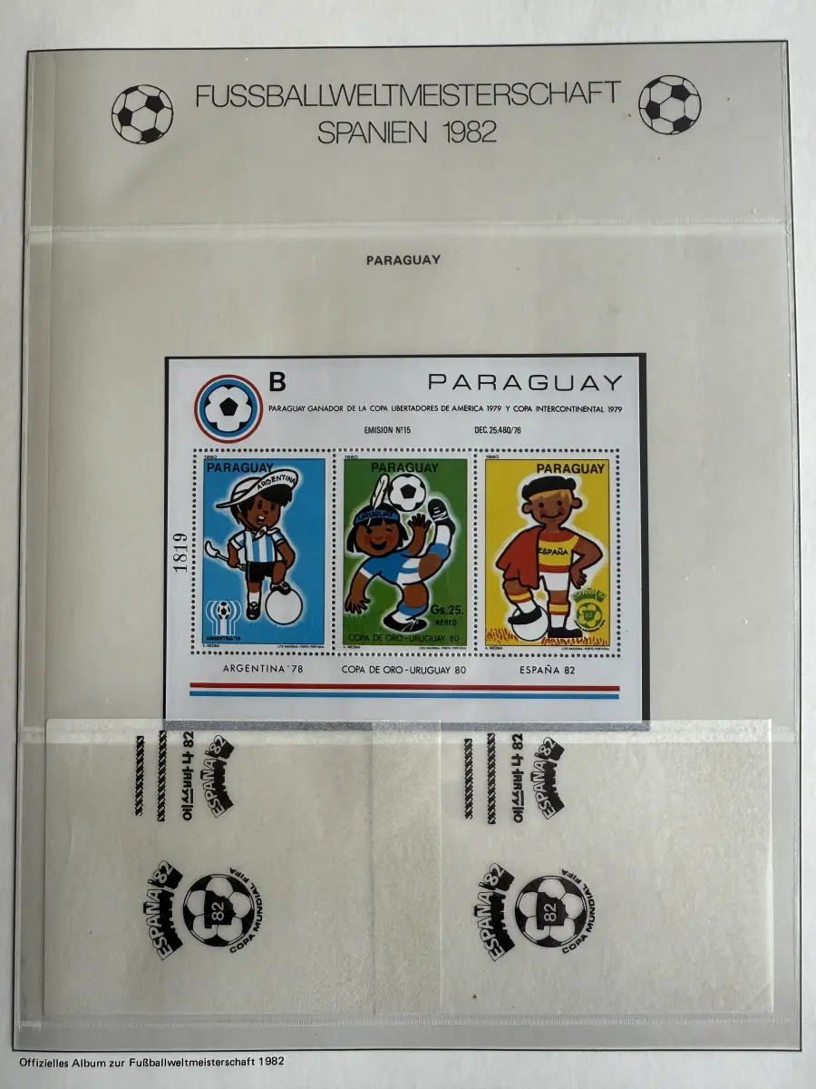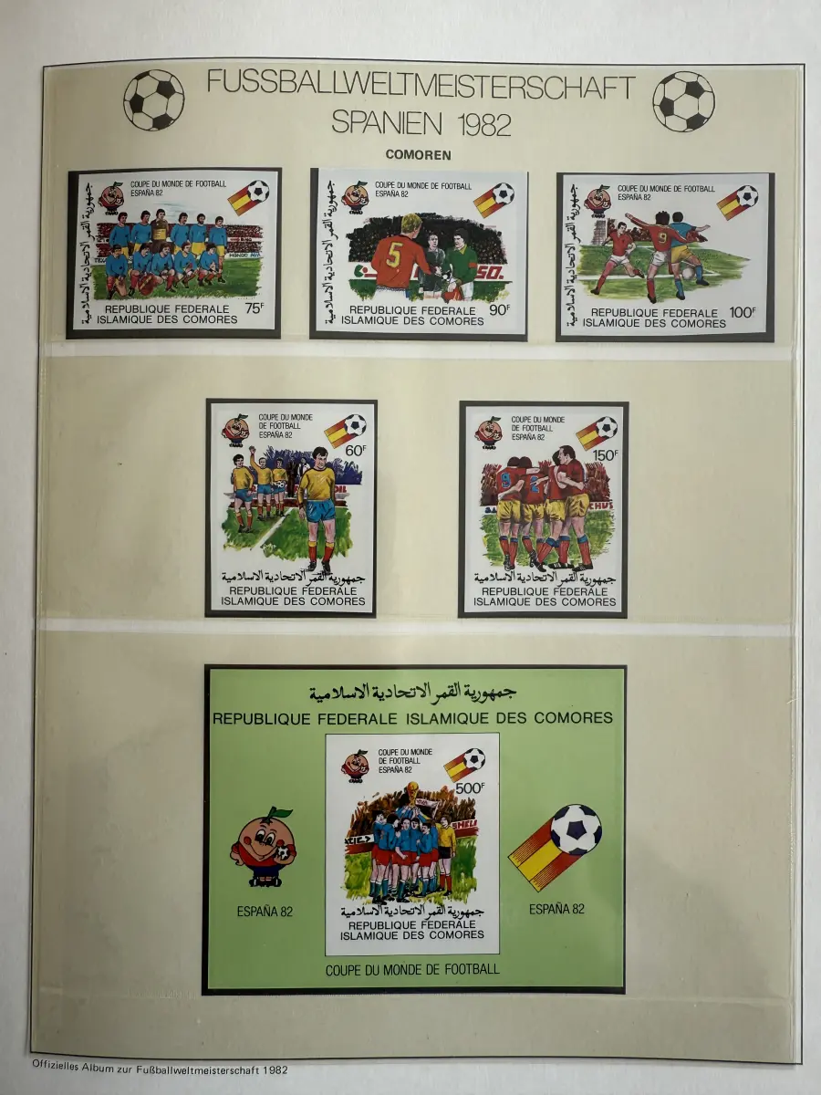 Sammlung zur Fußball-Weltmeisterschaft 1982 in Spanien, in vier prallvollen offiziellen FIFA-Vordruckbindern nach Sieger-Abo gesammelt. Die gut erhaltenen grünen Lindner-T-Vordruckbinder zeigen alle die passende Goldprägung. Auf über 240 Vordruckblättern finden sich die postfrischen Briefmarken und Blöcke von Andorra bis Zentralafrika, die zu diesem Anlass erschienen sind - ergänzt mit interessanten Belegen. Von einigen Ausgaben sind auch die teuren ungezähnten Parallel-Ausgaben enthalten. Der Abopreis war gigantisch!