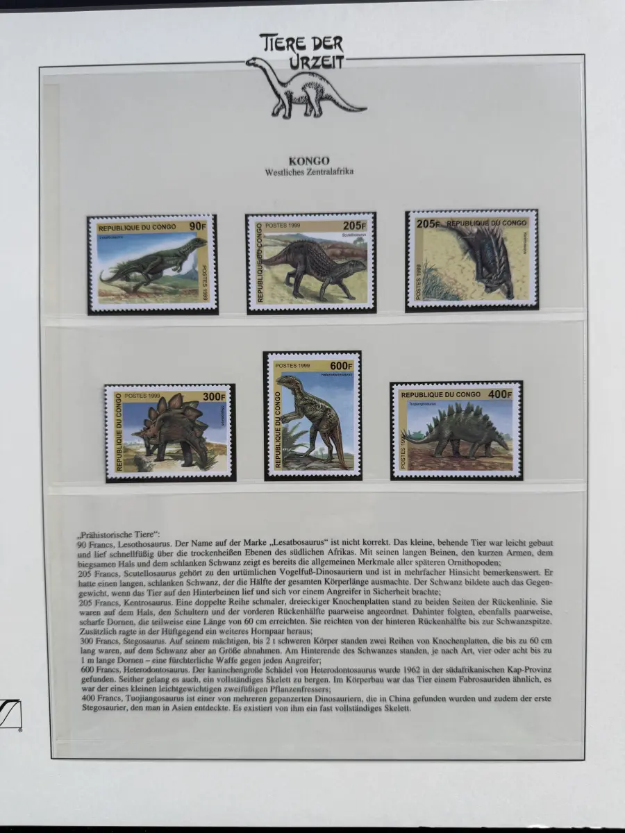 Prallvoller schwarzer Lindner-T-Ringbinder mit passender Goldprägung beinhaltet eine herrliche, dekorative Motiv-Sammlung zum Thema "Dinosaurier" aus Sieger-Abo. Die illustrierten Lindner-T-Seiten mit weichmacherfreien Folien enthalten viele postfrische Marken, Blocks und Kleinbogen - alles aus Afrika. Alle ca. 60 Seiten sind abgebildet. Der Abopreis war gigantisch.