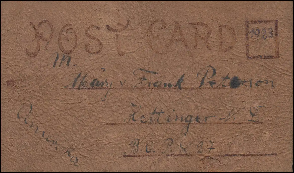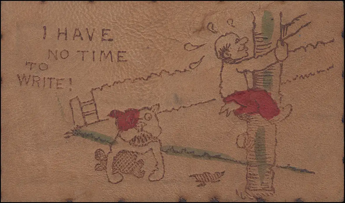 USA Post Card aus echtem Leder, Karikatur, Hunde-Attacke, um 1923