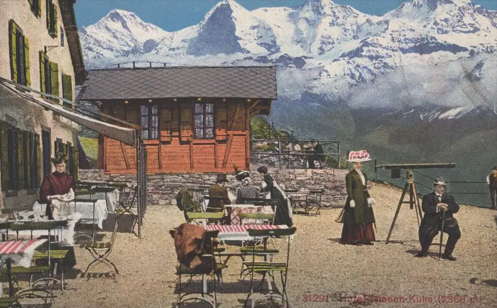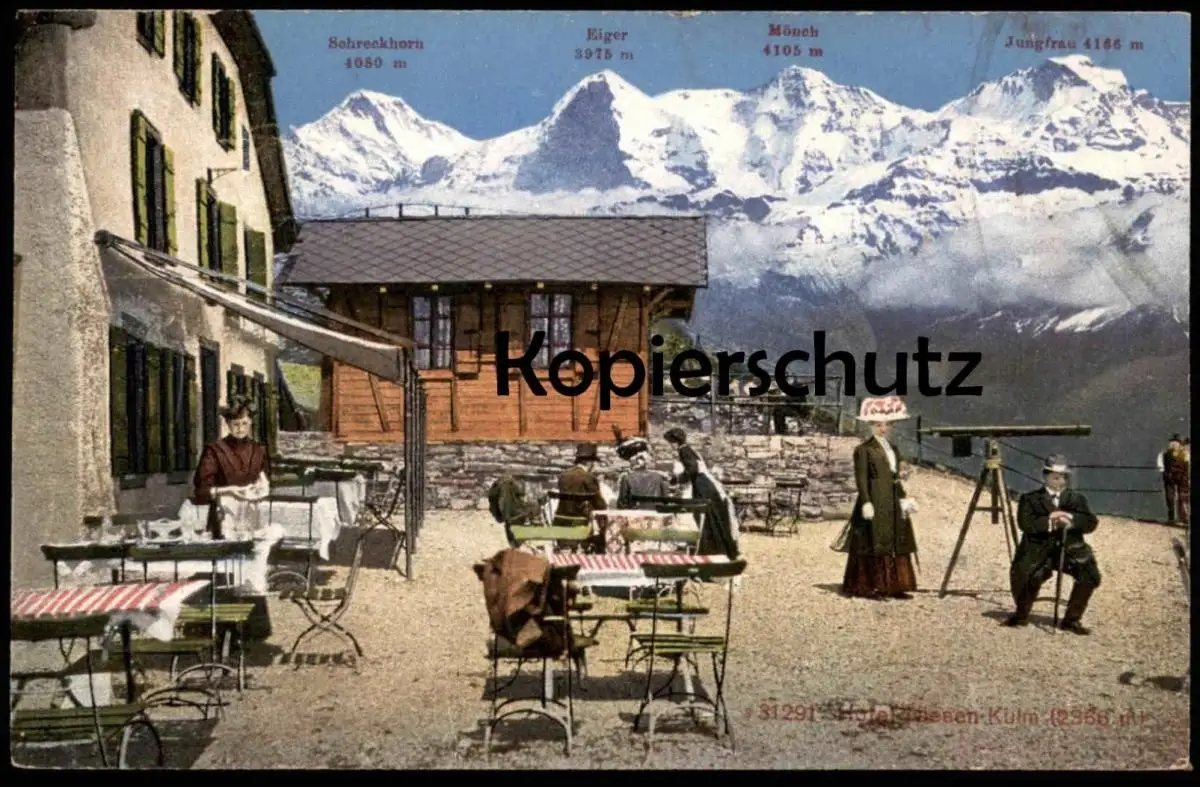 ALTE POSTKARTE HOTEL NIESEN-KULM FRAU AM FERNROHR SCHRECKHORN EIGER MÖNCH JUNGFRAU telescope Ansichtskarte cpa postcard