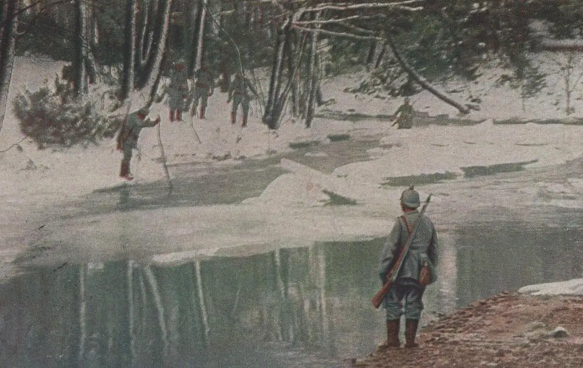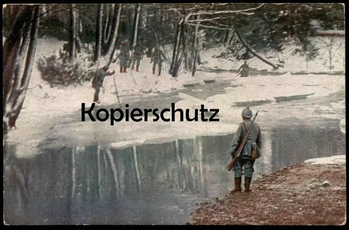 ALTE POSTKARTE IM RUSSISCHEN WALDE SOLDAT AM FLUSS TEICH EIS UNIFORM Russia russian river cpa Ansichtskarte postcard AK