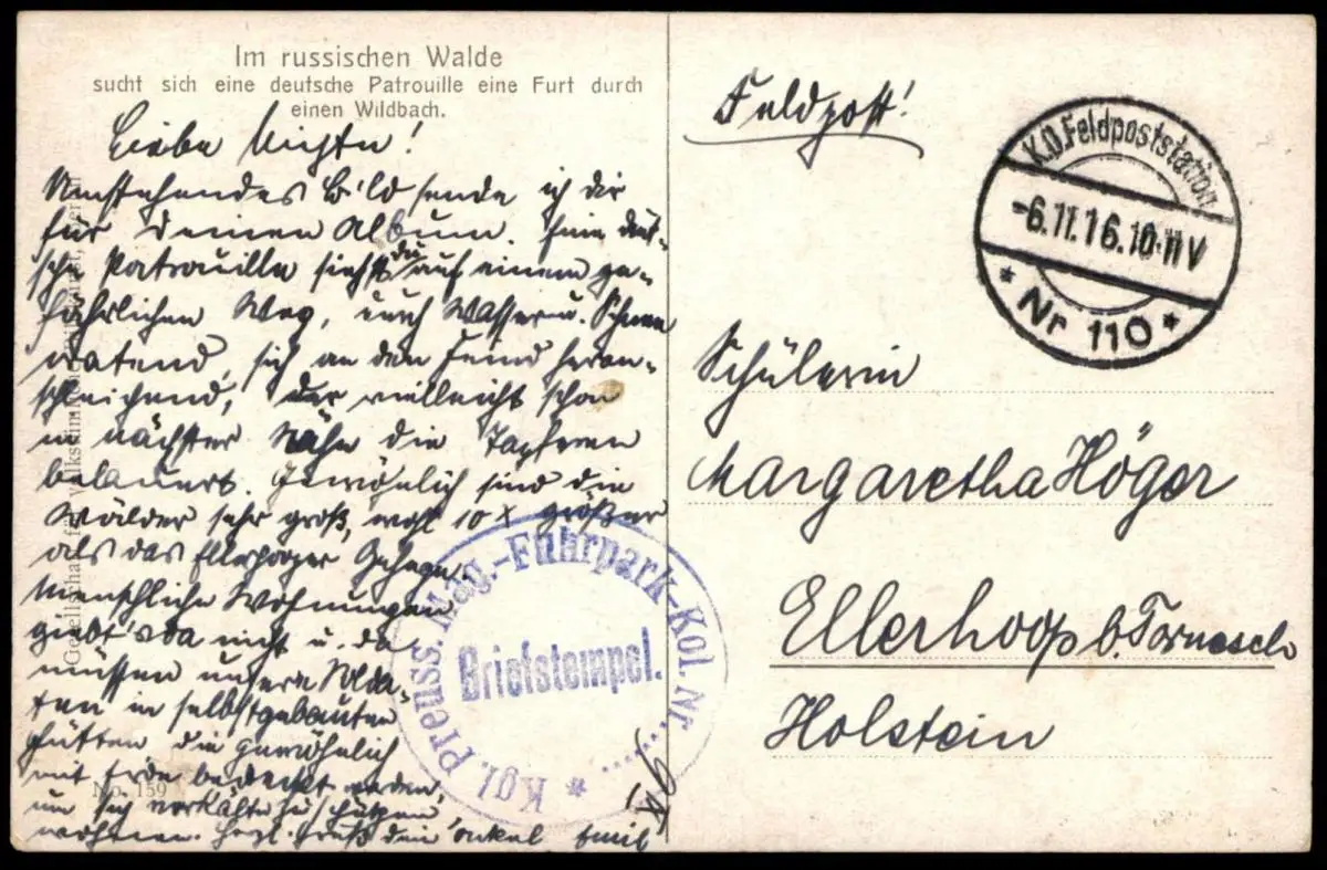Gelaufen: 06.11.1916 als Feldpost & Stempel Mag. Fuhrpark-Kol. nach Ellerhoop bei Tornesch