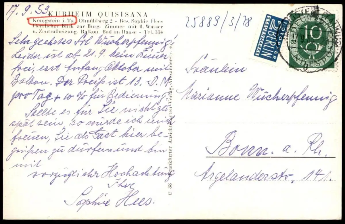 Gelaufen: 17.09.1959 mit Stempel Königstein nach Bonn am Rhein
