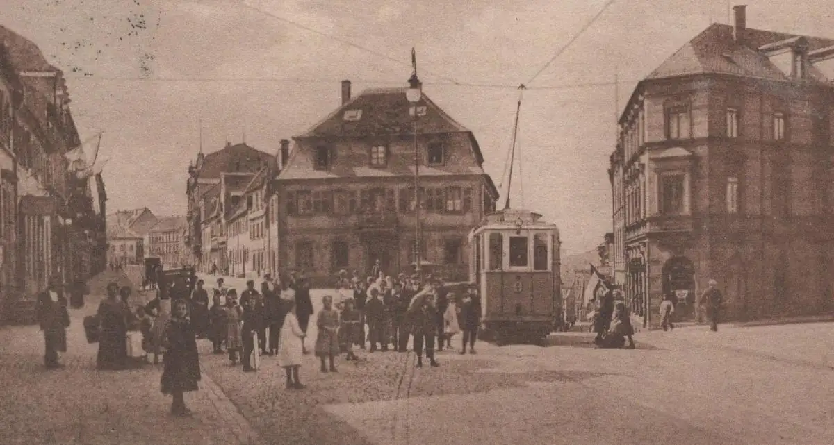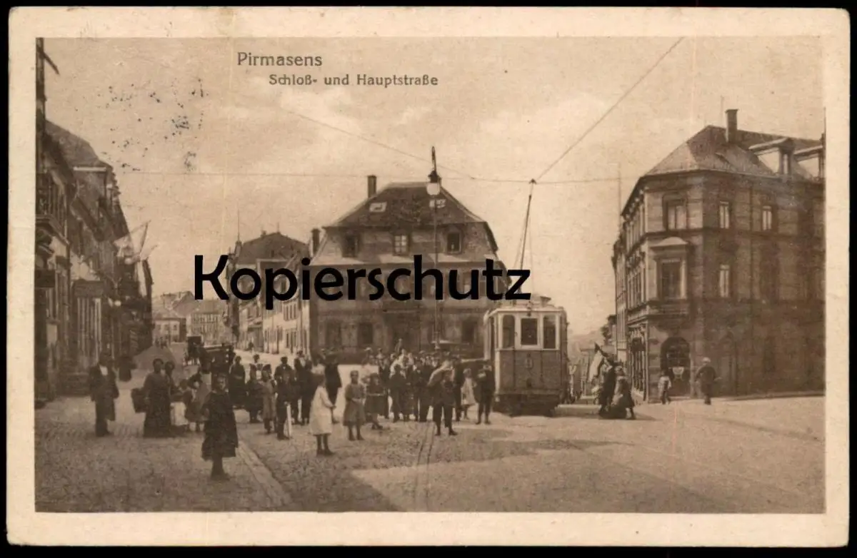 ALTE POSTKARTE PIRMASENS SCHLOSS- UND HAUPTSTRASSE tram tramway Briefmarke Volksstaat Bayern postcard cpa AK
