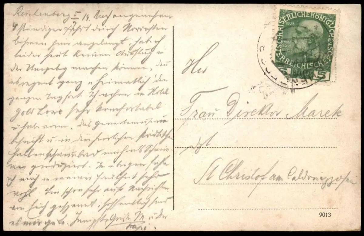 Gelaufen: 05.04.1914 mit Stempel Reichenberg nach St. Christof