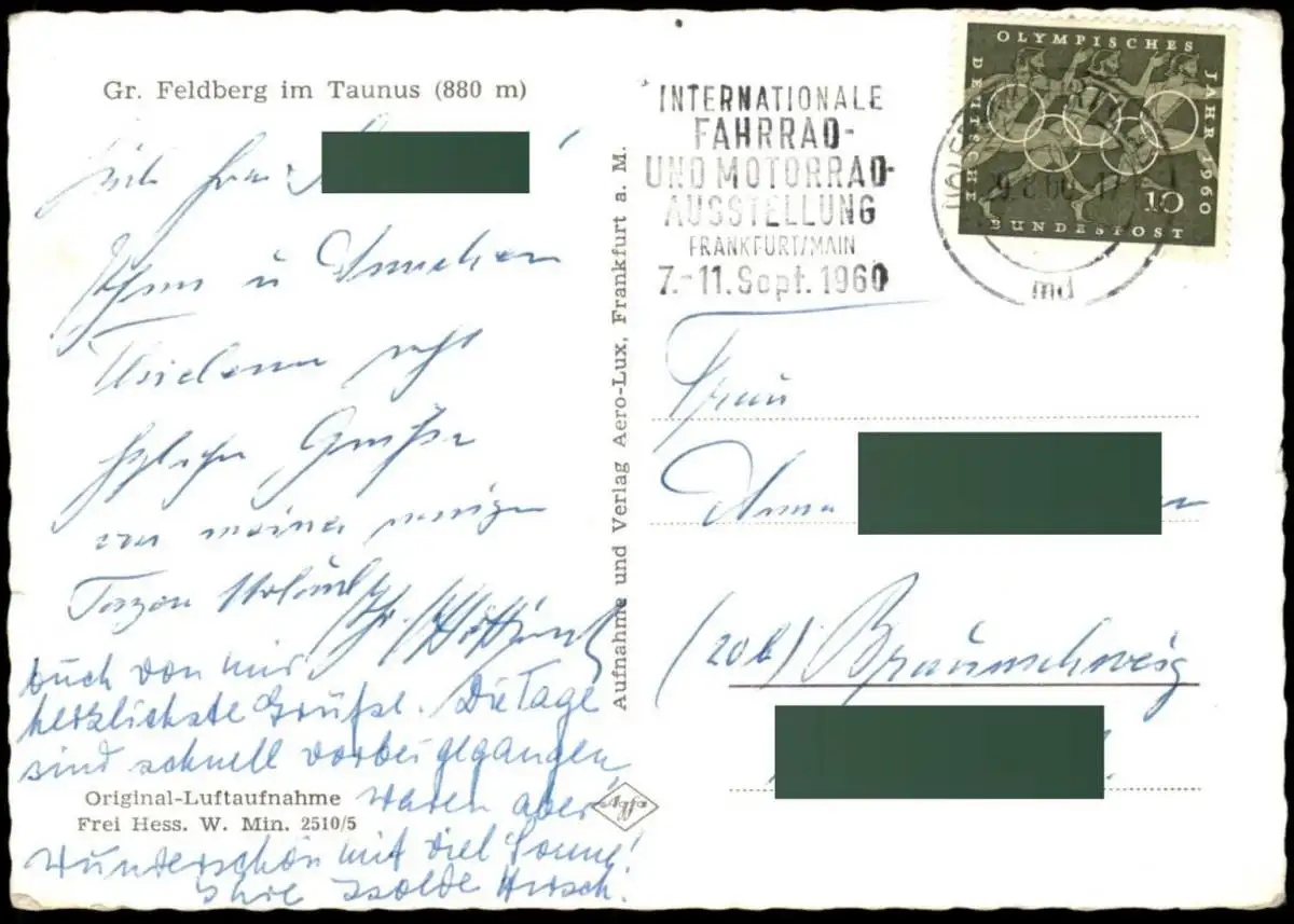 Verlag: Aero-Lux, FrankfurtGelaufen: 09.08.1960 mit Stempel Frankfurt sowie Maschinenwerbestempel “Internationale Fahrrad- und Motorradausstellung Frankfurt / Main 07. - 11.09.1960” nach BraunschweigErhaltung (s. Scan): gut - mittel, rechte untere Ecke etwas bestoßen / 915345